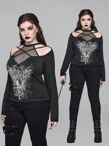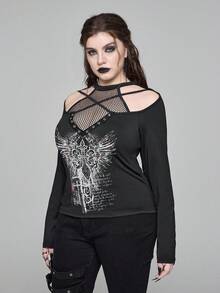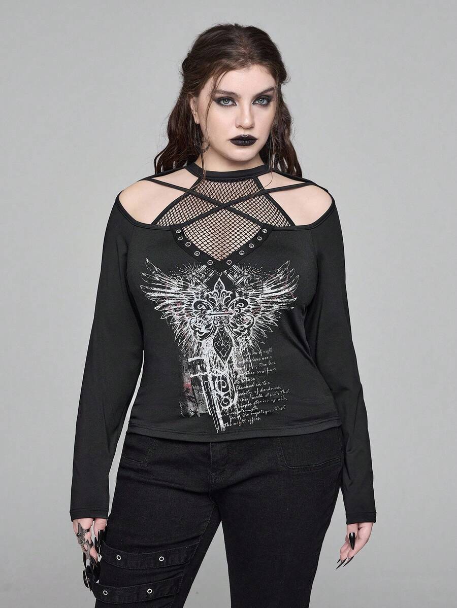 EDITION Plus Size Gothic Style Mesh Halter Cross & Wing Print Long Sleeve Blouse, Street Wear Plus Size T-Shirt For Autumn/Winter