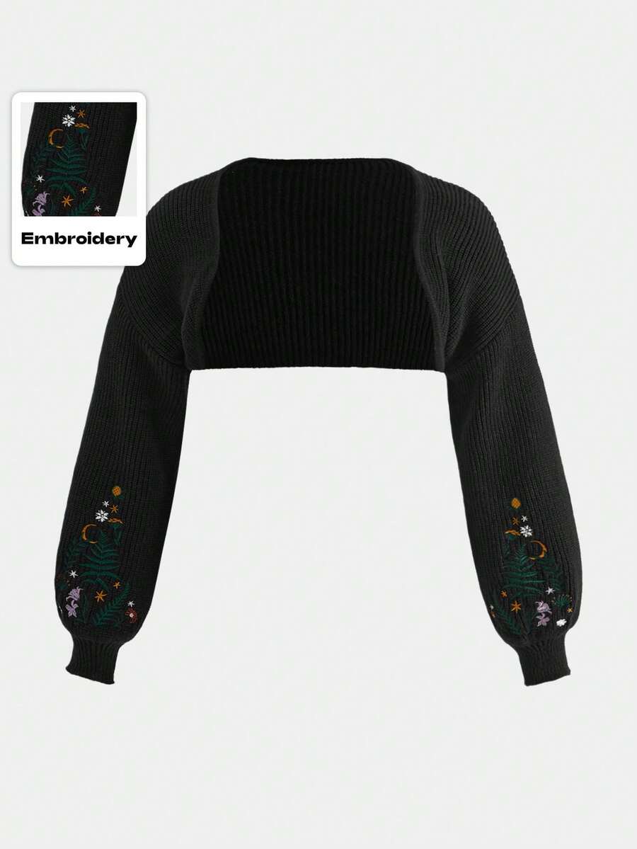 Goth Plus Size Gothic Thorns, Moon, Jungle Fern & Floral Embroidered Cardigan Sweater, Plus Size Cropped Long Sleeve Knit Cardigan Sweater, Plus Size Women Autumn/Winter Tops, Plus Size Women Short Knit Cardigan Jacket For Autumn/Winter