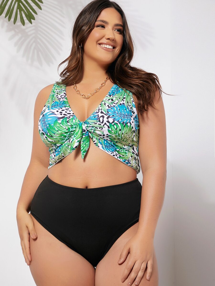 Plus Size Leopard & Tropical Knot Front Bikini Set Summer Beach