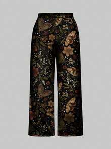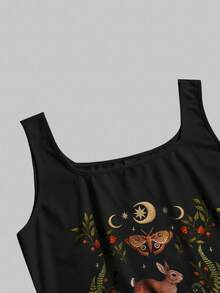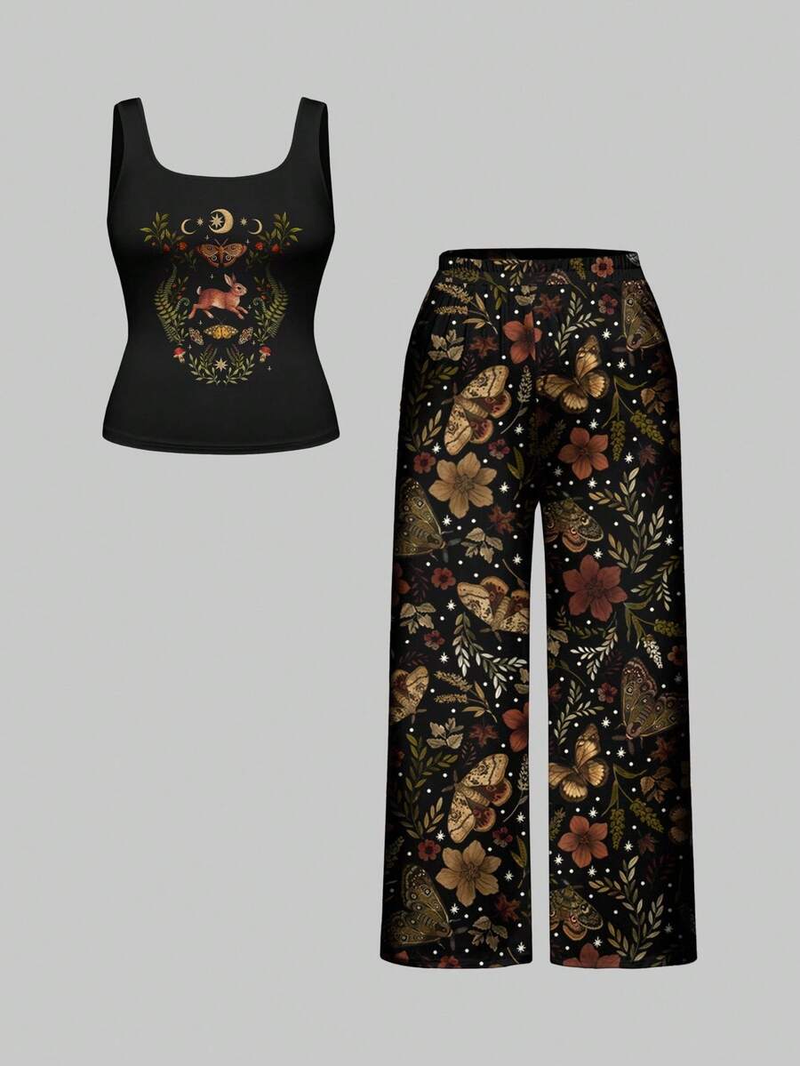 Fairycore Plus Size Moth, Plant, Rabbit Embroidery & Mushroom All-Over Print Sleeveless Top And Pants Pajama Set, Casual Loungewear