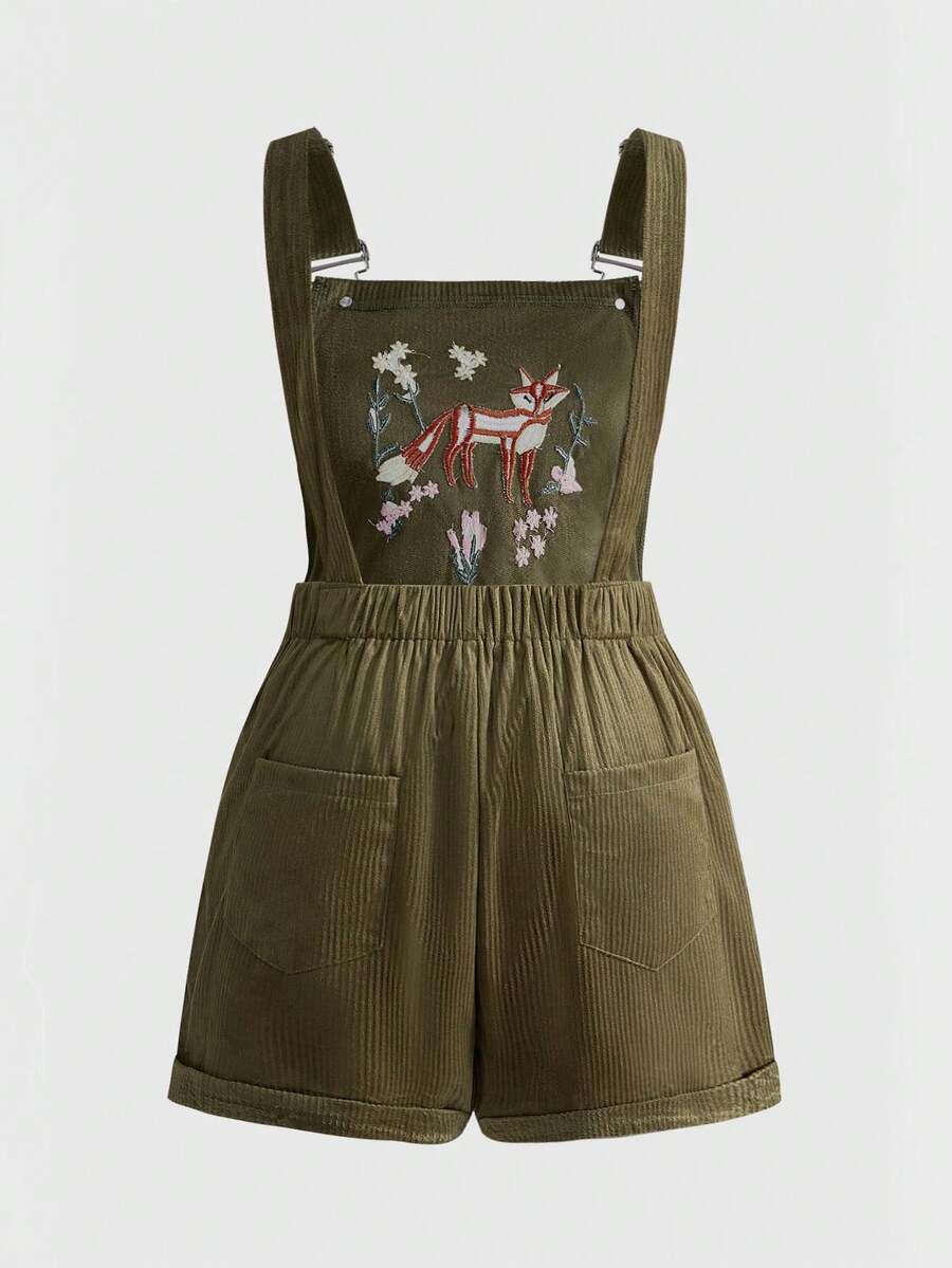 Fairycore Plus Size Retro Forest Fox Embroidered Corduroy Jumpsuit