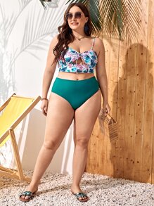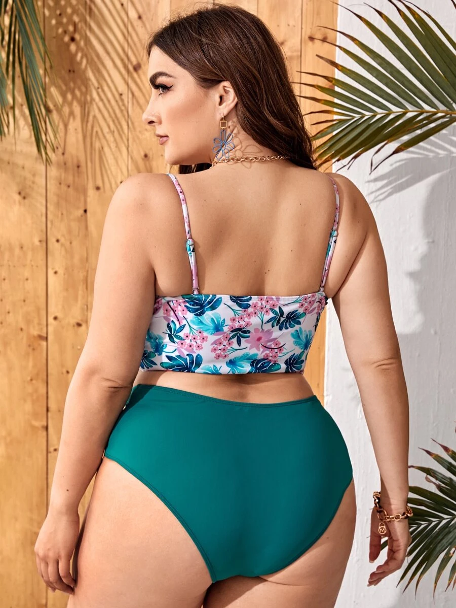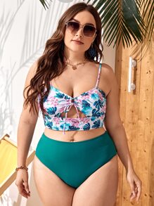Plus Size Tropical & Floral Cut-Out Knot Bikini Set Summer Beach