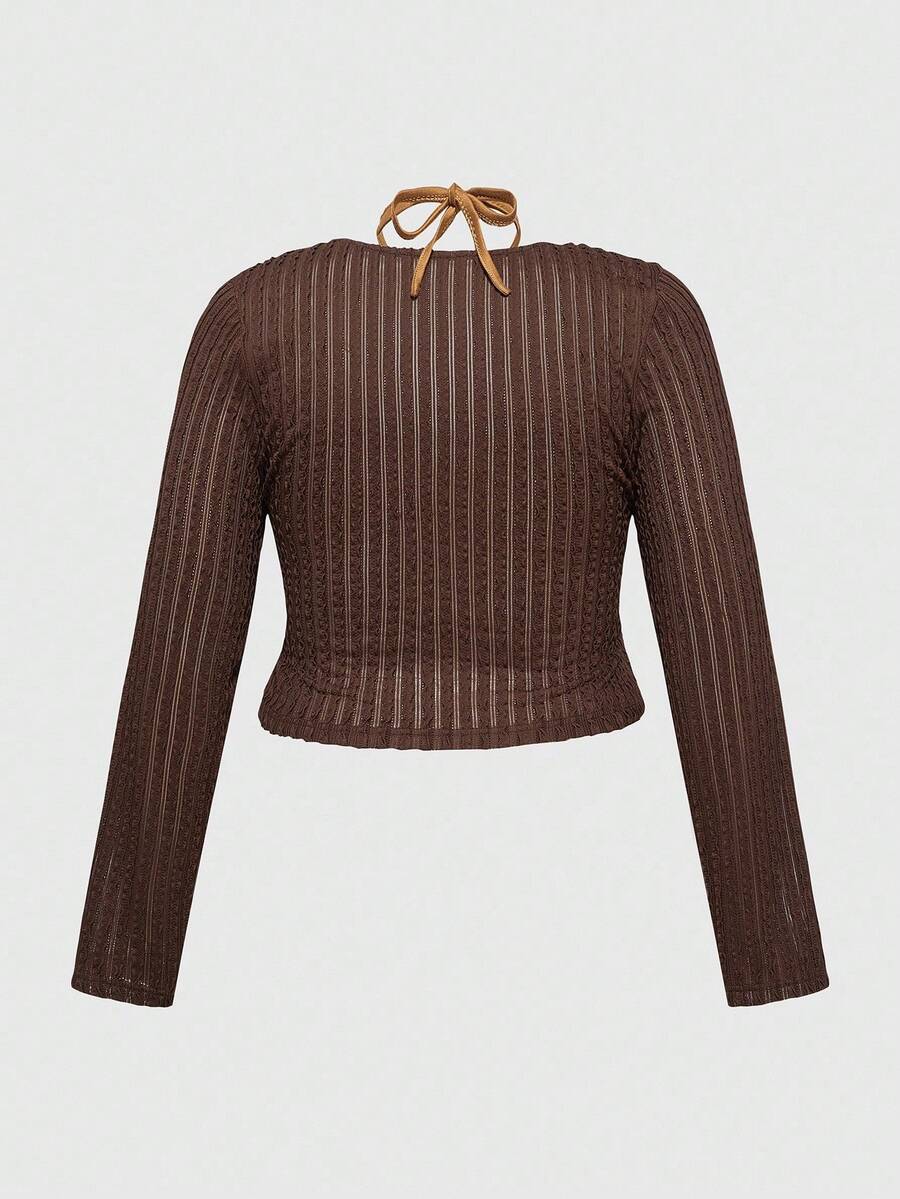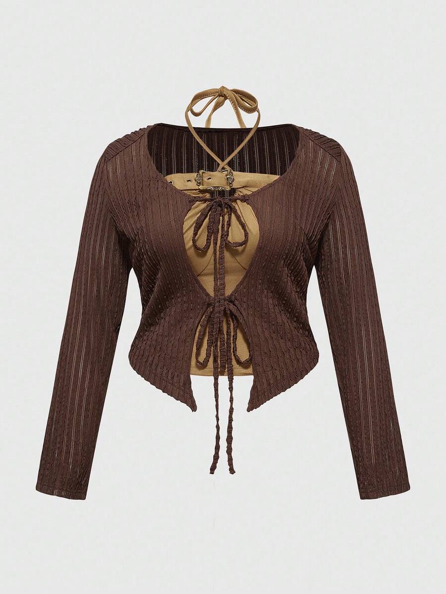ROMWE Avant Plus Size Vintage Color Block 2 In 1 Suedette Knit Tie Front Halter Shirt Jacket, Autumn/Winter Street Style Plus Size Women Top, Brown Color Women Autumn/Winter Top, Vintage Maillard Color Women Top Jacket