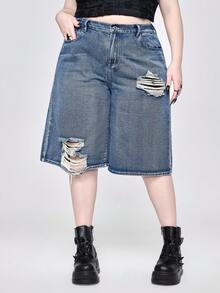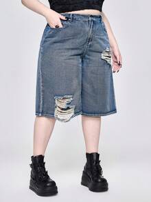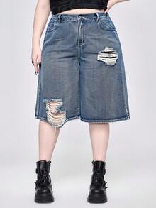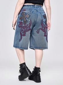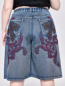 Grunge Punk Plus Size Vintage Cross Embroidered 7/8 Length Jeans