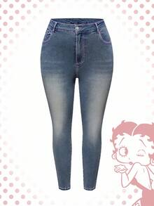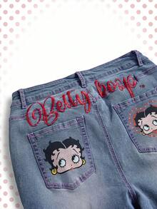 Betty Boop | ROMWE Plus Size Washed Letter & Figure Embroidery Skinny Jeans