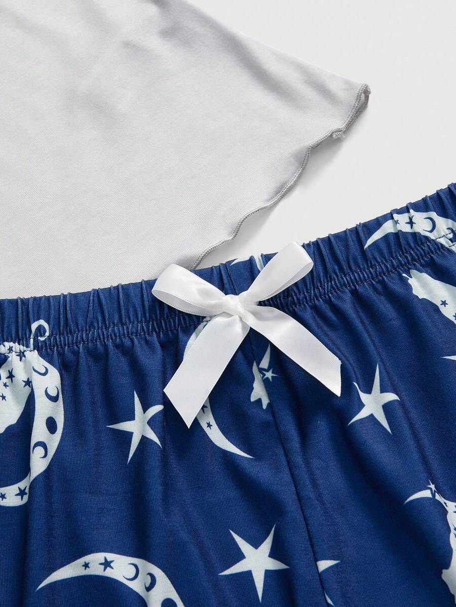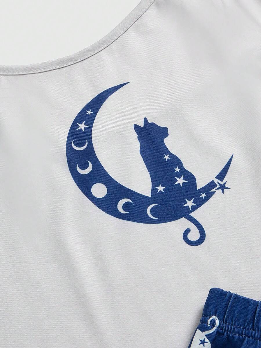 Plus Size Women Cat Pattern Moon And Star Camisole And Shorts Pajama Set