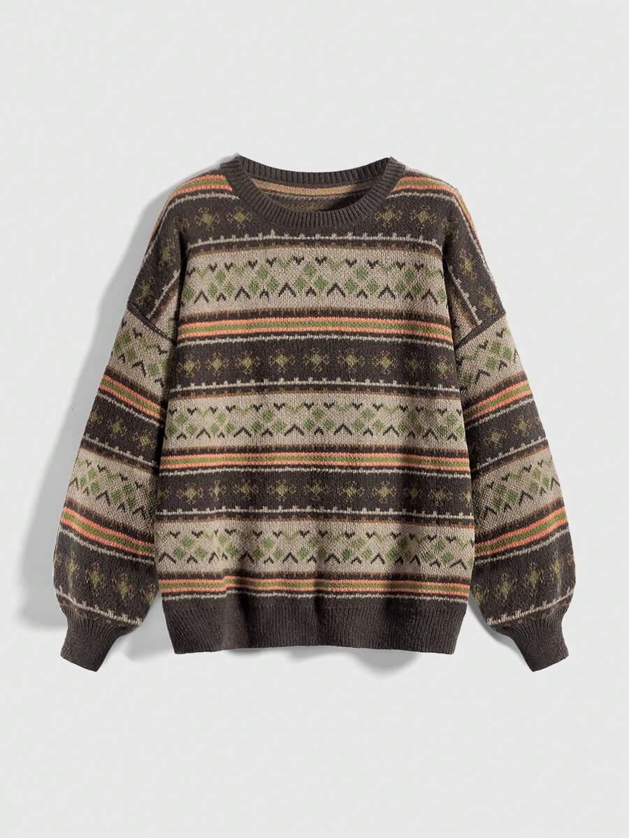Fairycore Plus Size Women Geometric Pattern Long Sleeve Loose Retro Pullover Sweater, Autumn/Winter