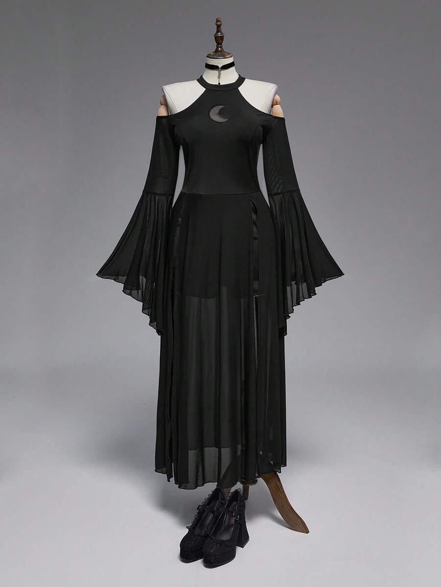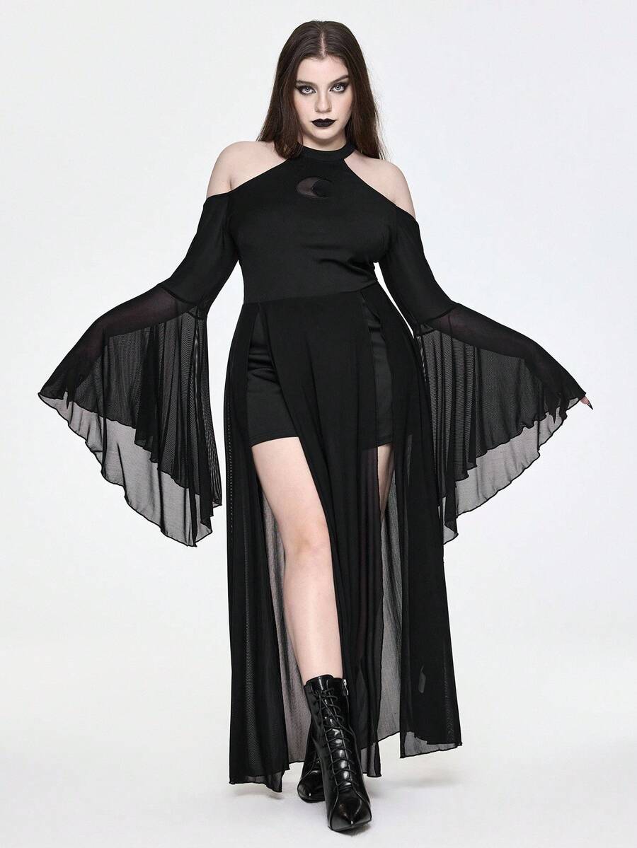 Goth Plus Size Women Gothic Crescent Moon Hollow Mesh Patchwork Off-Shoulder Flare Sleeve Dress