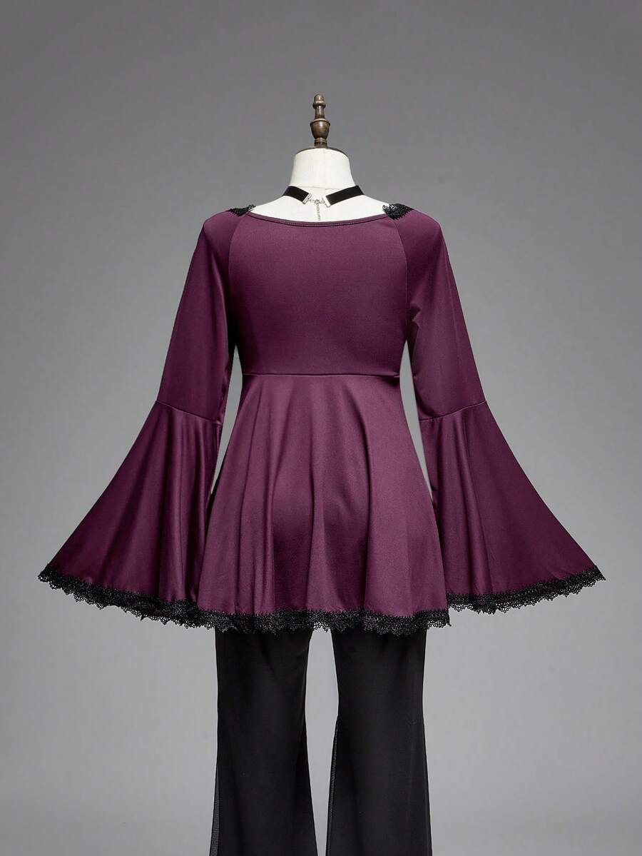 Goth Plus Size Women Halloween Lace Trim Hollow Out Flare Sleeve T-Shirt, Renaissance Style Top