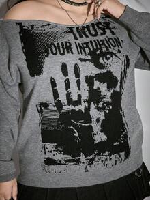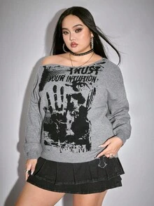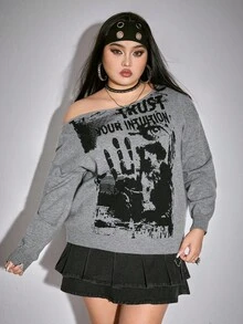 Grunge Punk Plus Size Women Skew Shoulder Vintage Music Festival Party Skeleton Tie-Dye Print Loose Plus Size Sweater/Winter