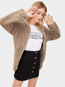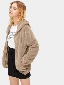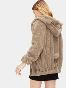 Pom Pom Elastic Hem Hooded Teddy Jacket