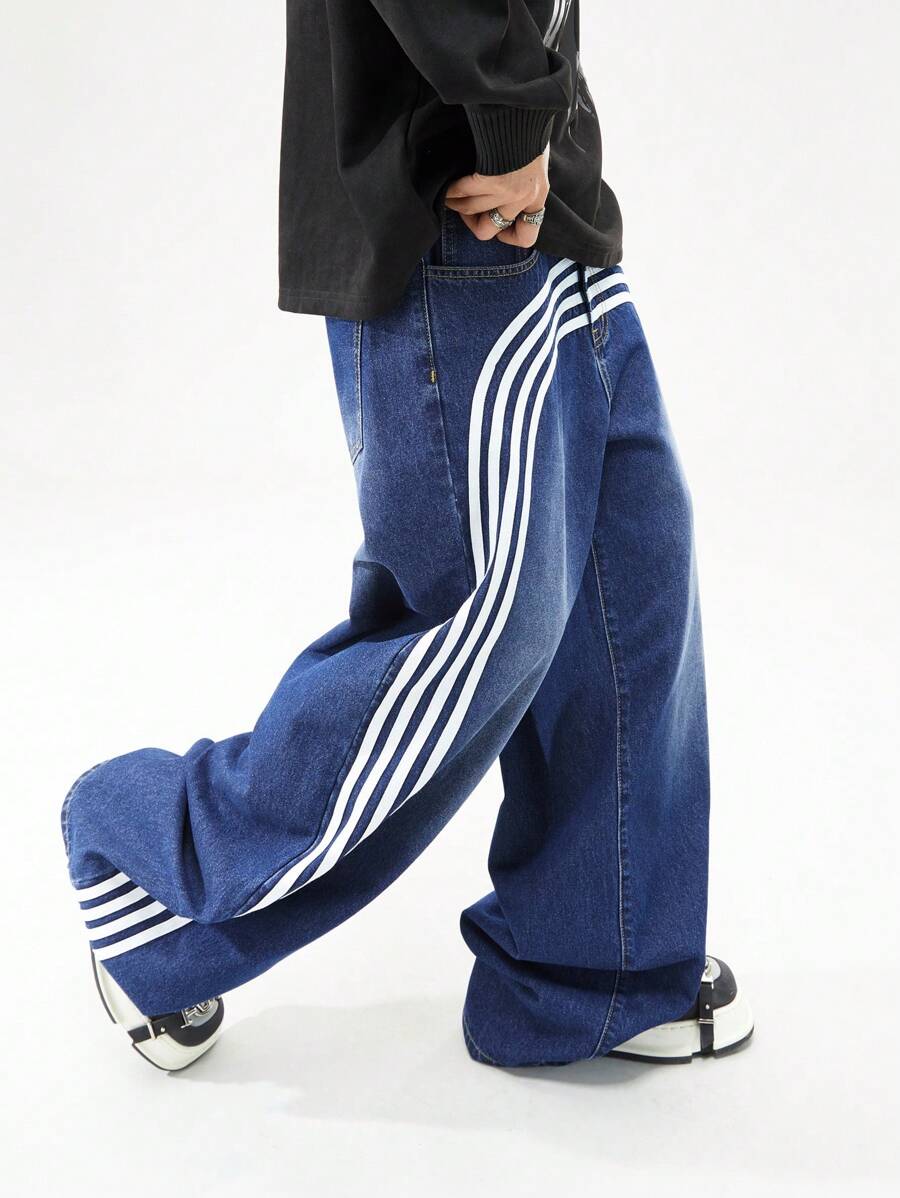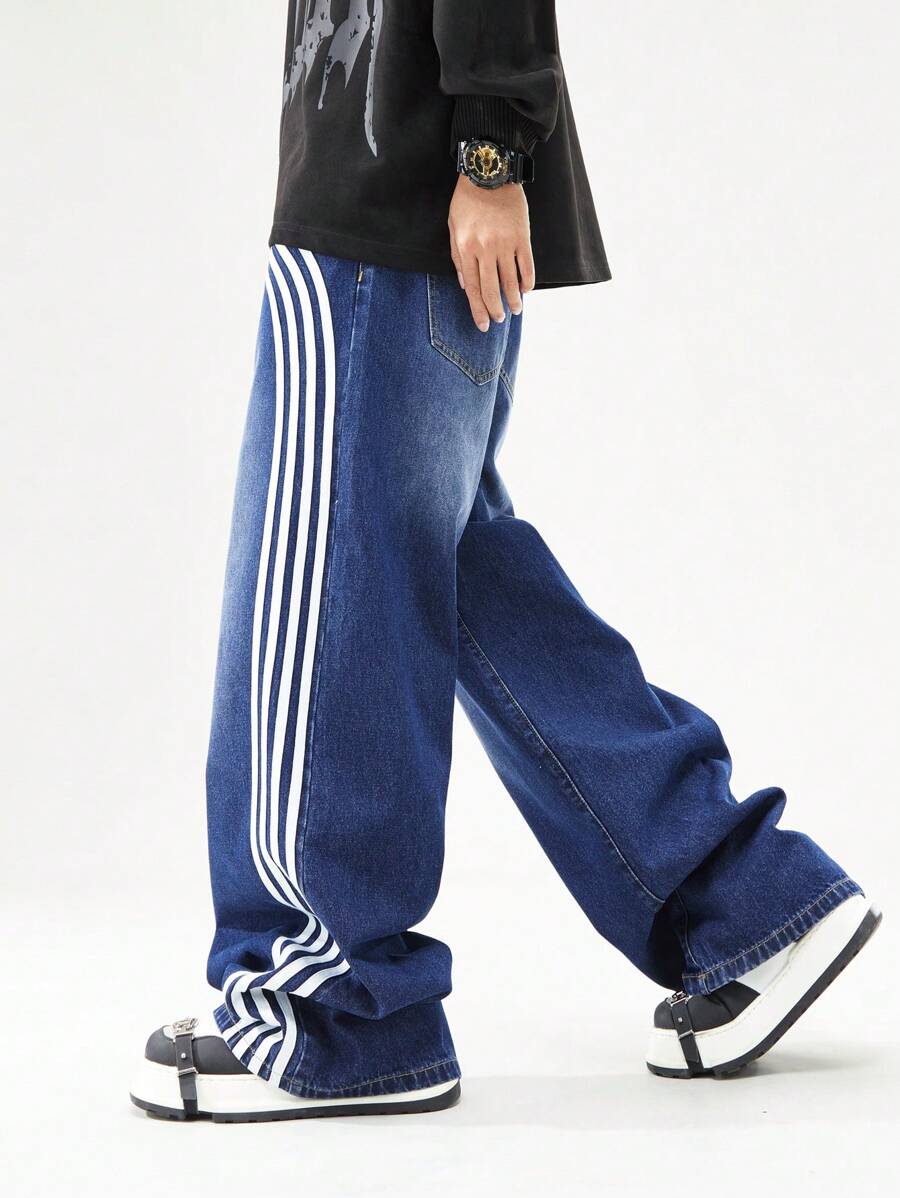 Prep Men's Loose Fit Casual Striped Pocket Wide Leg Denim Jeans