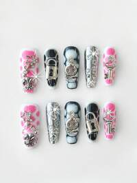 Anime 10pcs Y2K Retro Star, Polka Dot, Striped, Pop Art, Grunge, Music Note Decorative False Nails, Handmade, Suitable For College, Music Festivals, Dates, Etc. Grunge Punk 10pcs Punk Baddie Style Spider, Heart, Star, Bow Handpainted High-Quality False Nails + 3pcs Double-Sided Adhesive, Reusable Y2K Style Rhinestone, Chain Pendant, Solid Color Medium-Long Coffin Fake Nails, Suitable For Holidays, Parties, Dancing And Daily Wear, Halloween