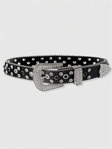 ROMWE Avant 1pc Women's Rhinestone Embellished Black Waist Belt, Versatile Denim Accessory