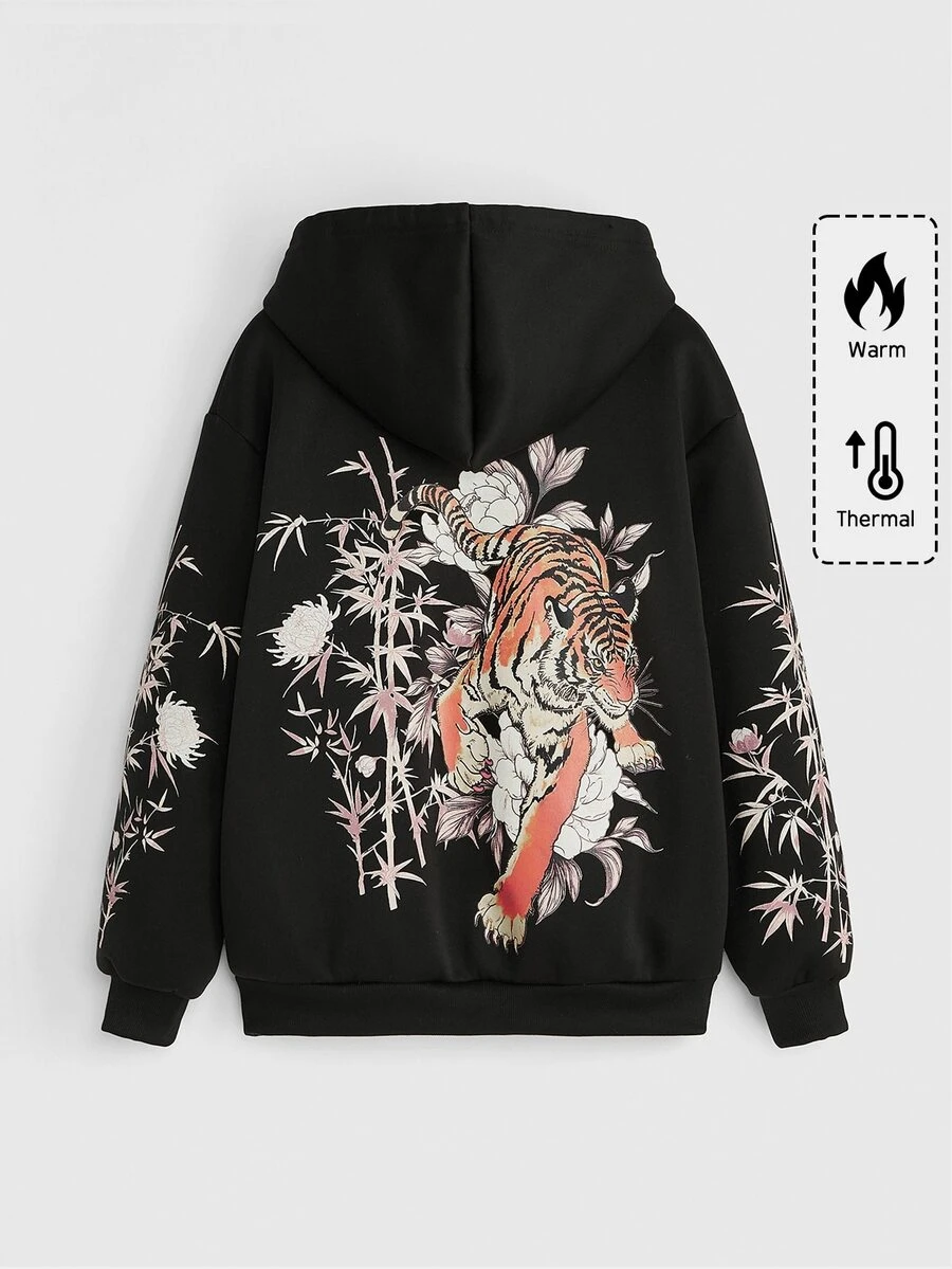 ROMWE Avant Chinese Style Tiger, Floral & Bamboo Embroidery Zip-Up Drawstring Hoodie, Street-Style Long Sleeve Sweatshirt
