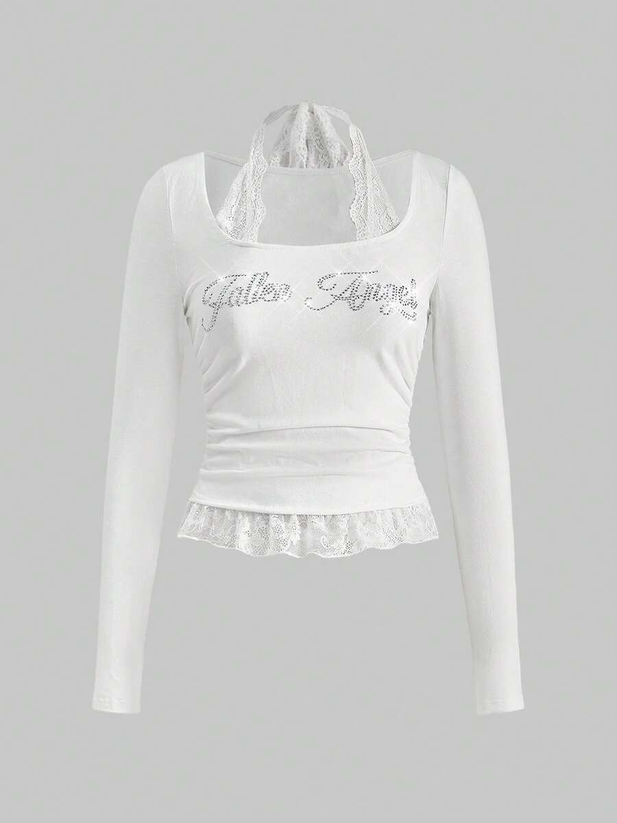 ROMWE Avant Garbage Punk Brother Letter Rhinestone & Lace Patchwork Crew Neck Fitted Women Long Sleeve T-Shirt