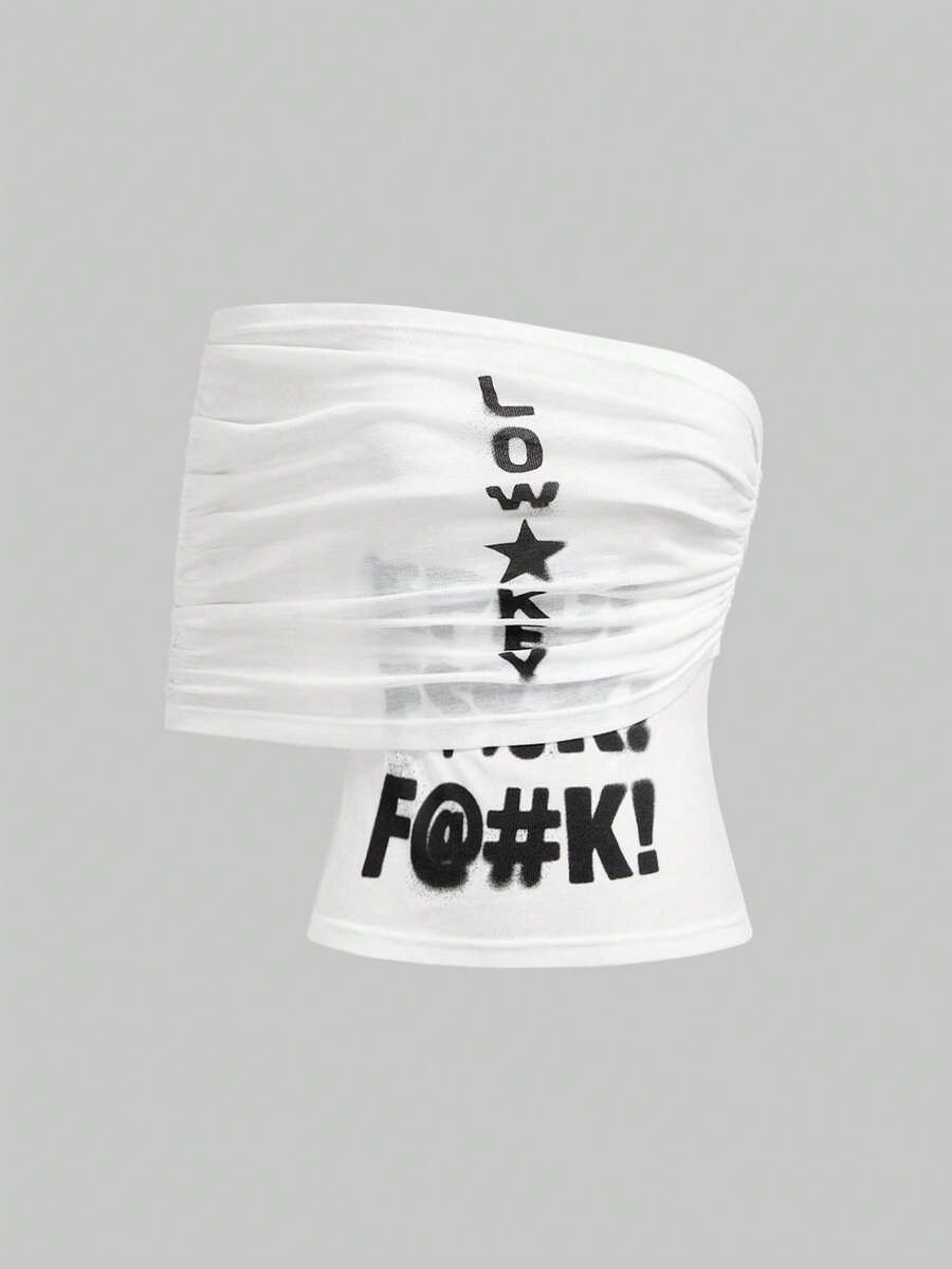 ROMWE Avant Sexy Babe Blurry Slogan Print Asymmetric Shoulder Fitted Women Top