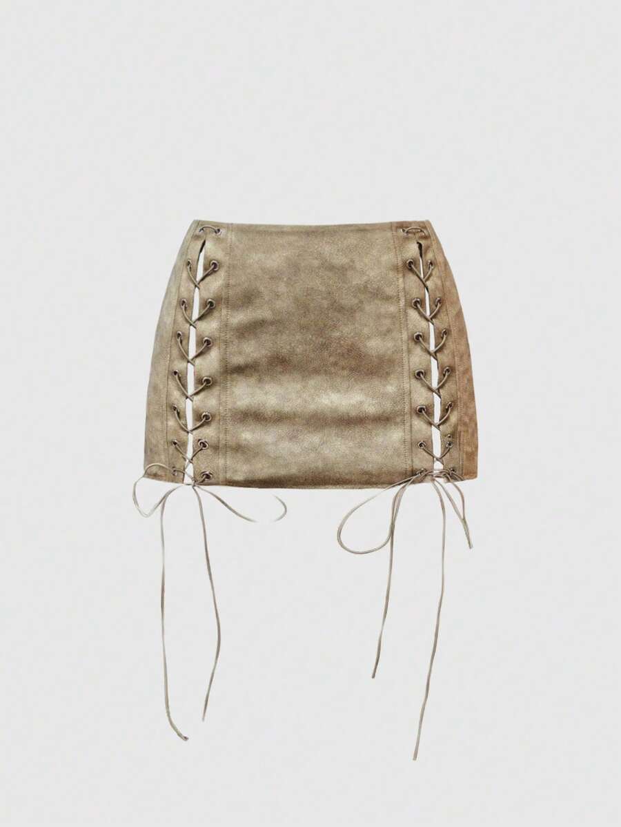 ROMWE Avant Sexy Retro Washed PU Lace-Up Super Low Waist Mini Skirt Design For Summer Concert Festival