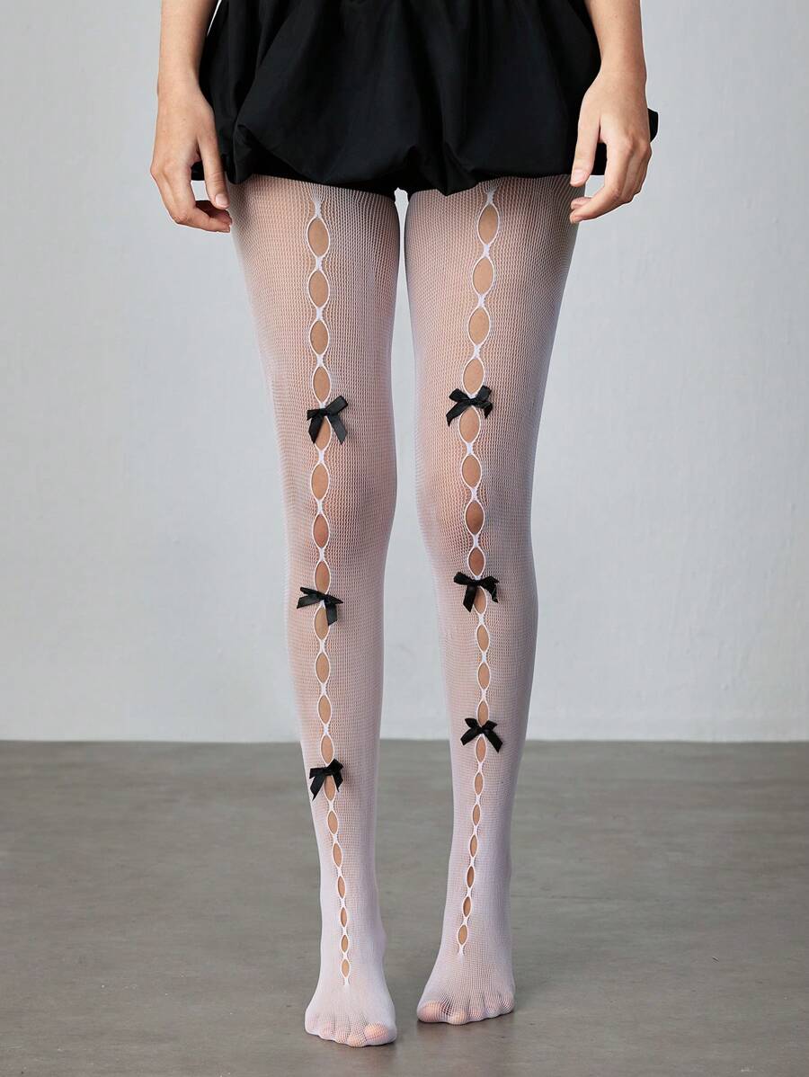 ROMWE Avant Sweet Lolita Fishnet Stockings With Bow And Hole Design, Black And White Matching JK Style Tights