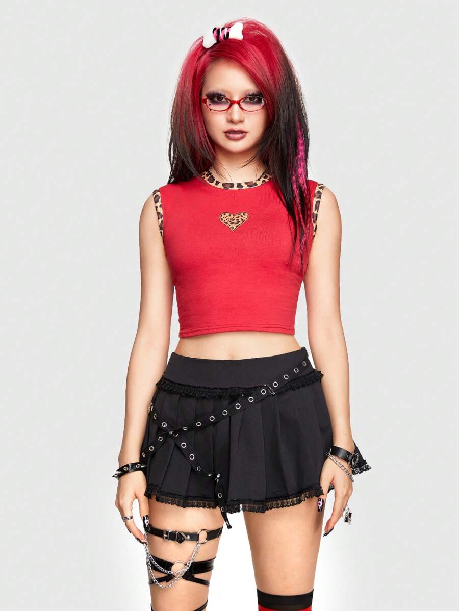 ROMWE Avant Vintage Y2k Leopard Print Splicing Heart Applique Cropped T-Shirt