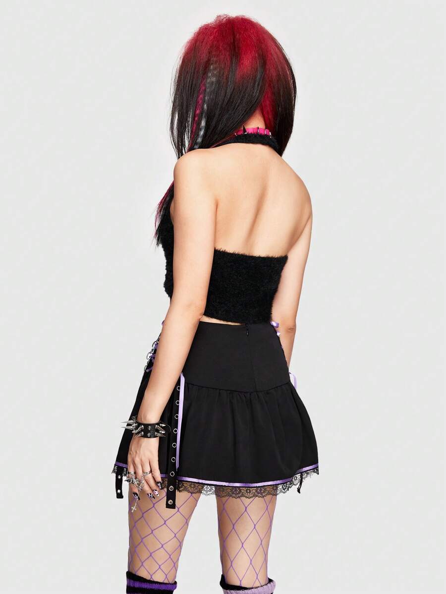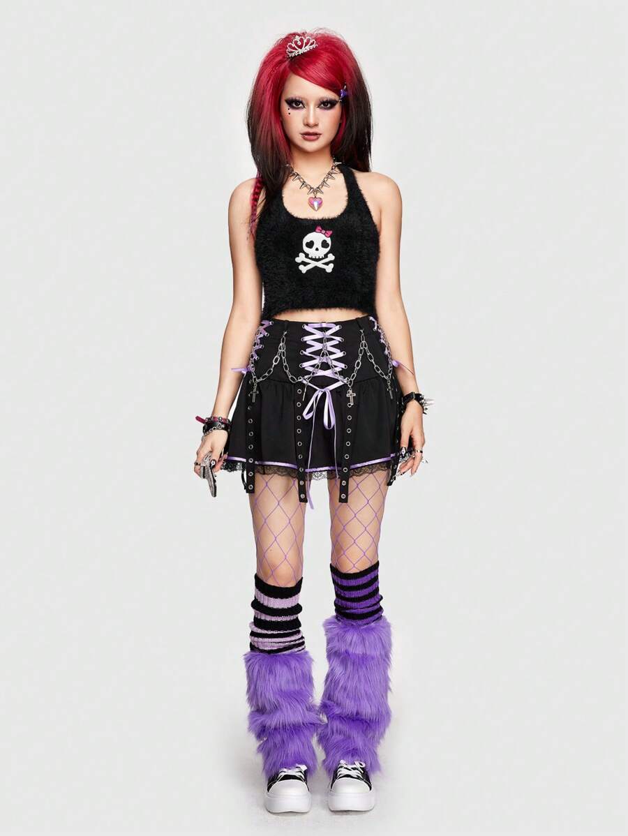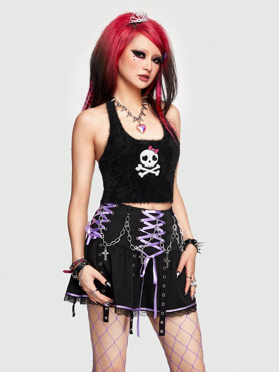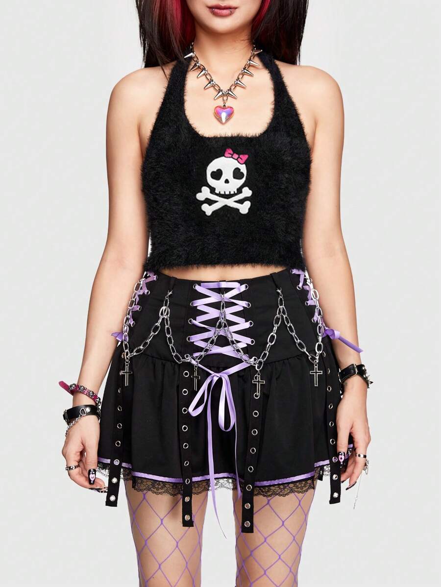 ROMWE Avant Women'S Knitted Halter Top With Skeleton Print Design And Neck Strap