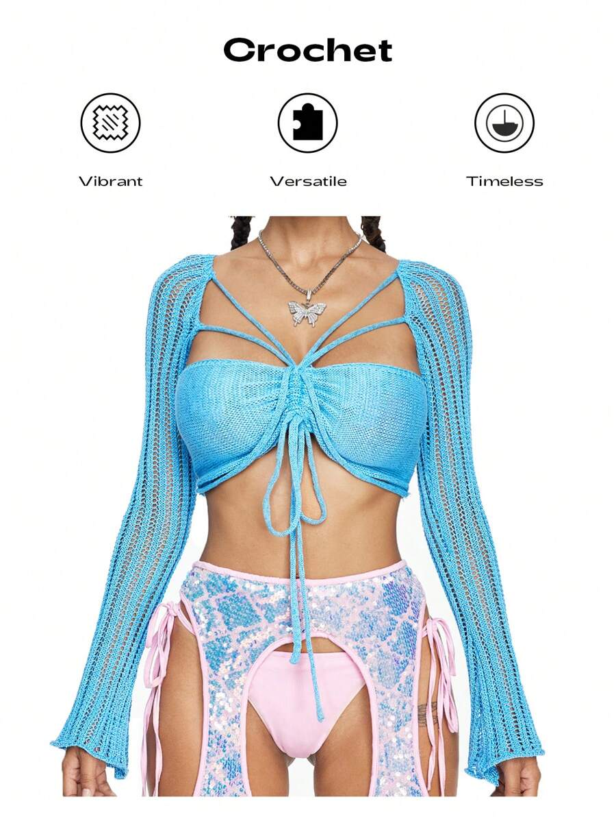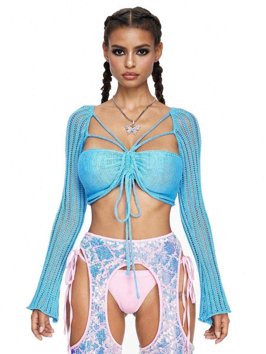 ROMWE Avant Women's Glossy Bow Tie Bell Sleeve Cropped Sweater, Rave Festival