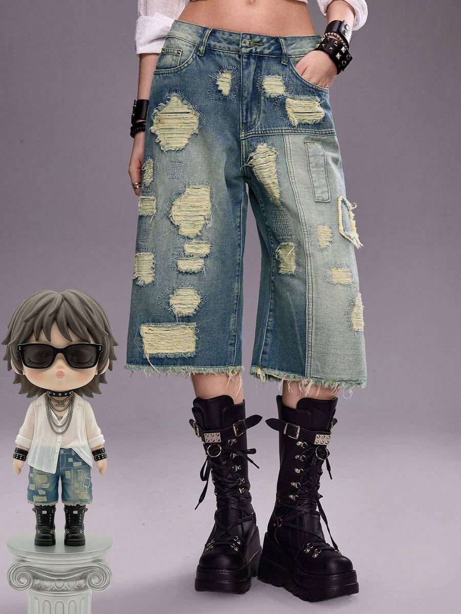 ROMWE Avant Women's Low Waist Super Loose Distressed Patchwork Capri Length Jeans