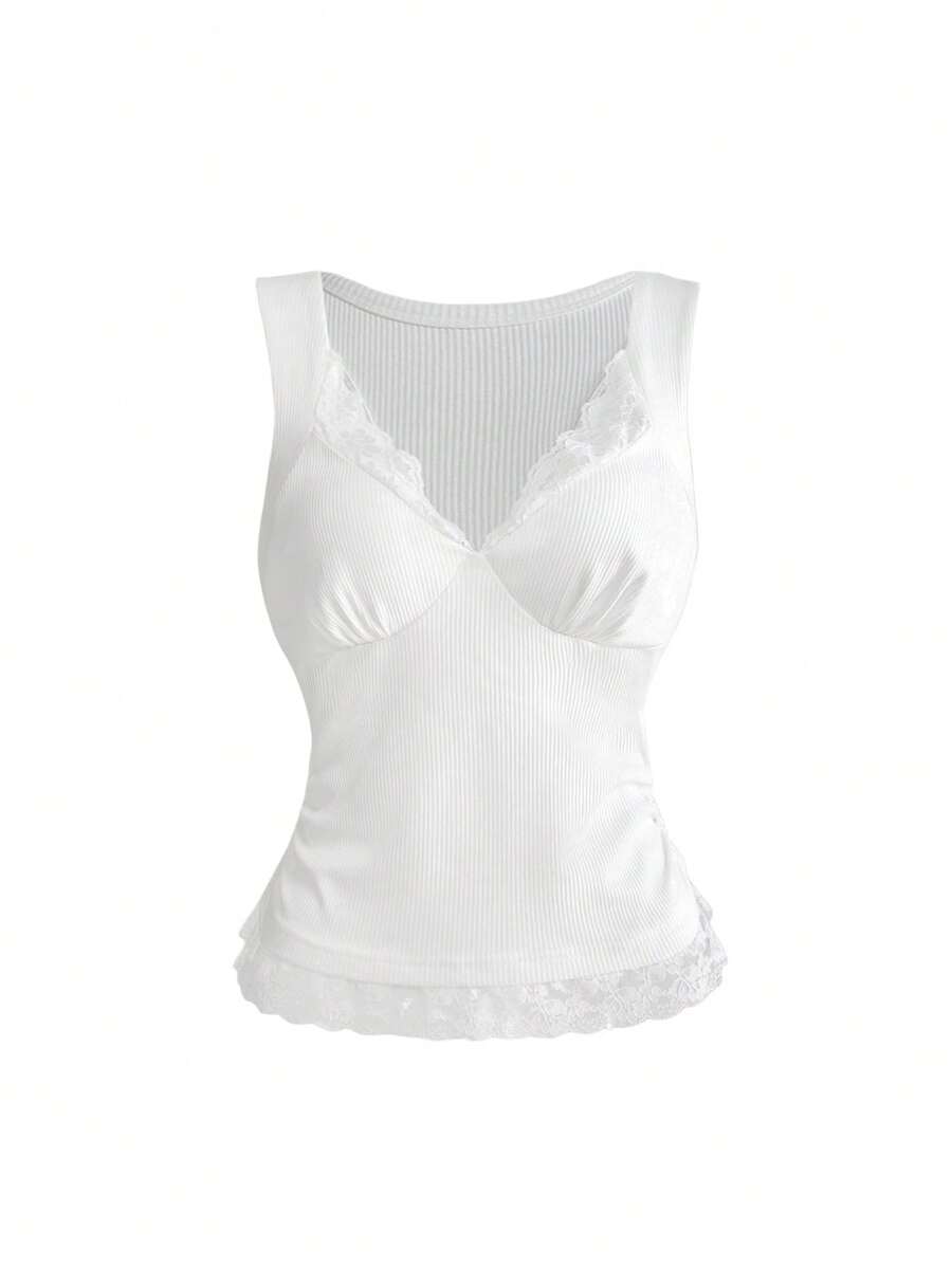 ROMWE Avant Women's Y2K Casual Everyday Commute Minimalist Versatile Contrast Lace Fitted White Tank Top, Summer