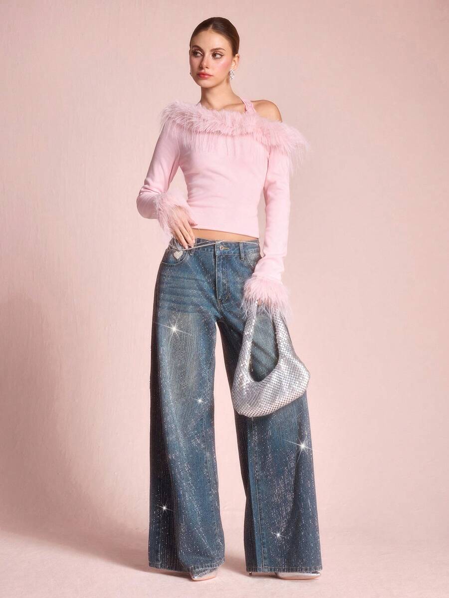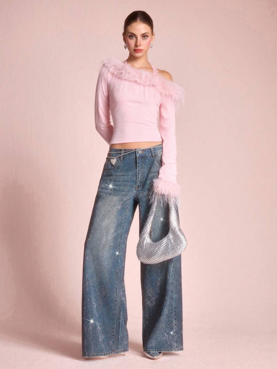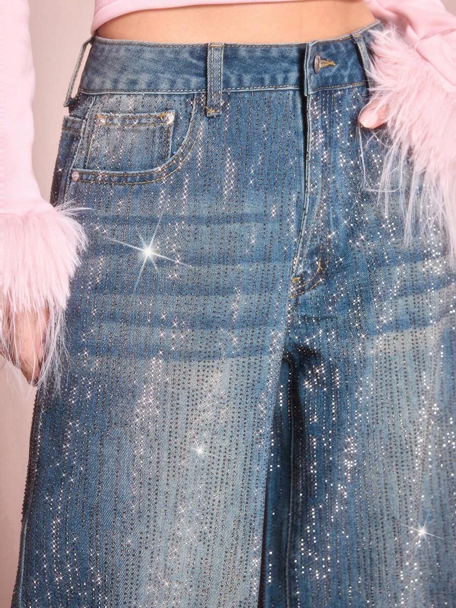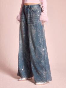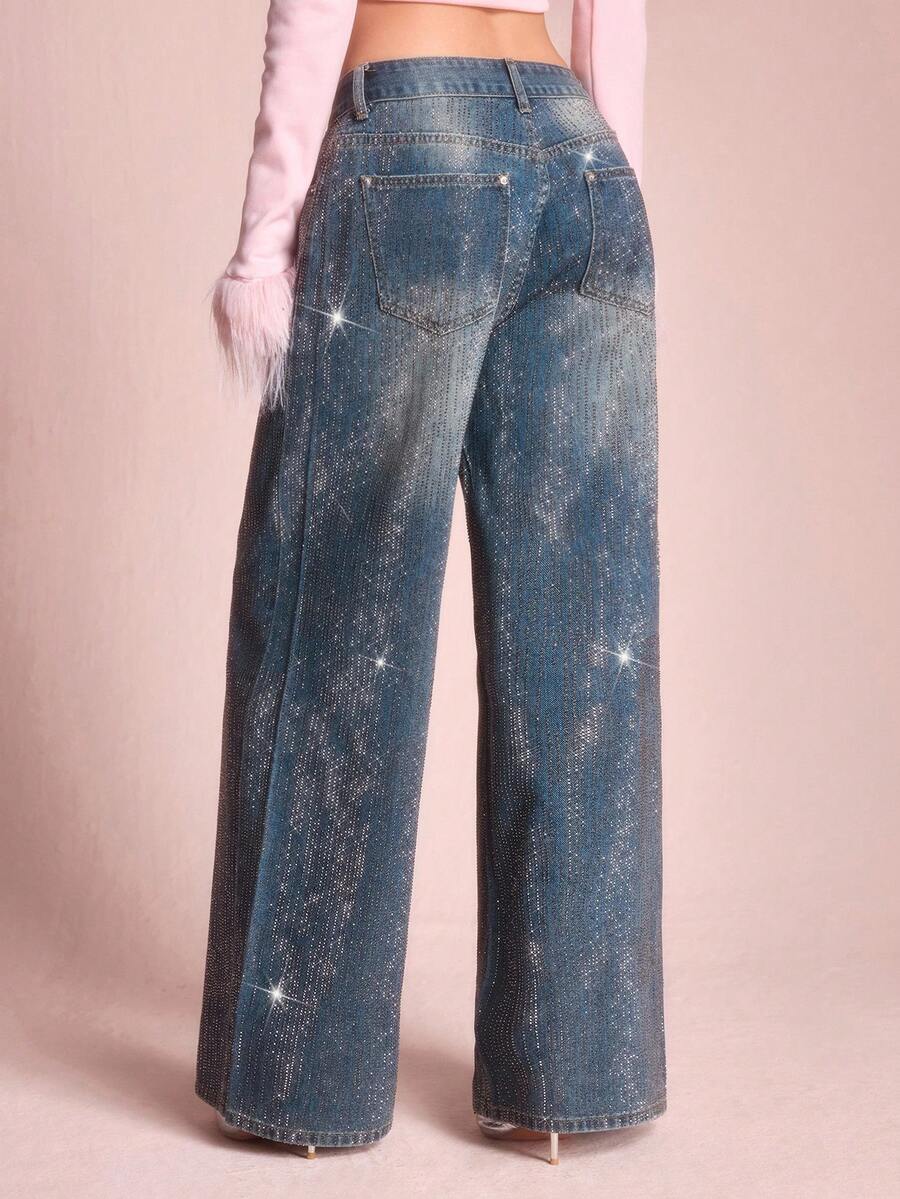 ROMWE Avant Y2K Glittery Loose Wide Leg Women Denim Low Waist Jeans For Rave Party
