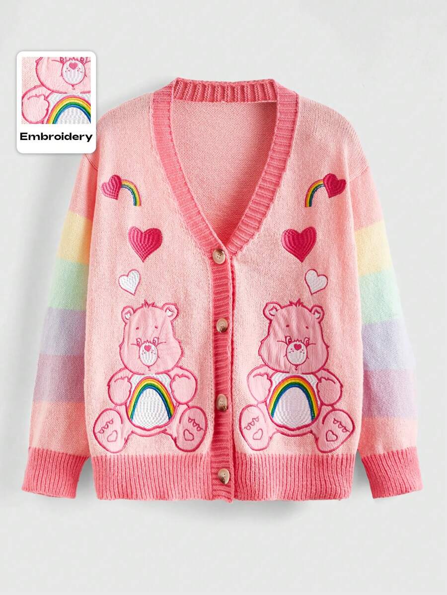ROMWE X Care Bears Bear Patch Embroidered Colorful Sleeves Cute Romantic Plus Size Sweater Cardigan, School
