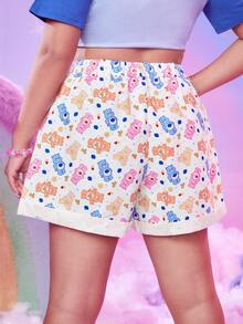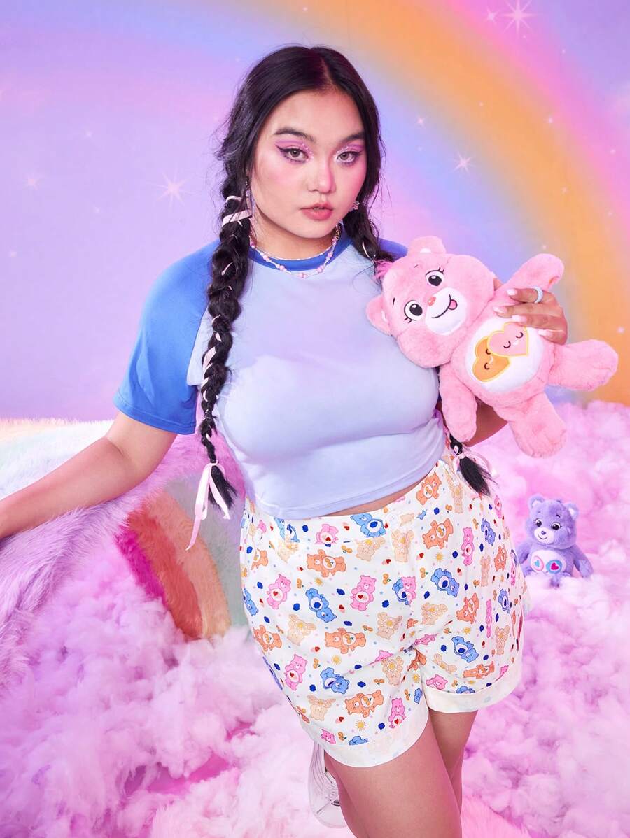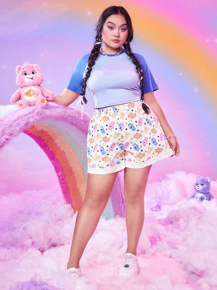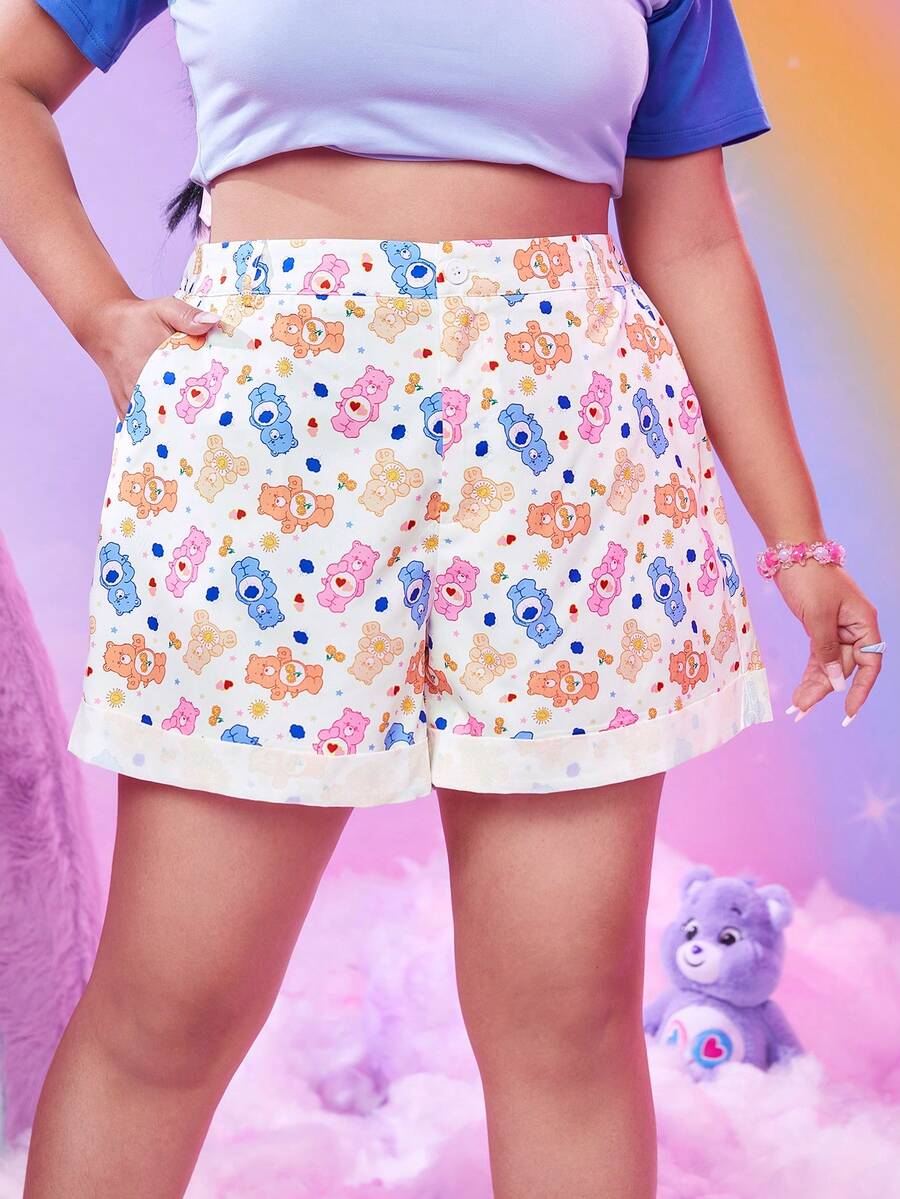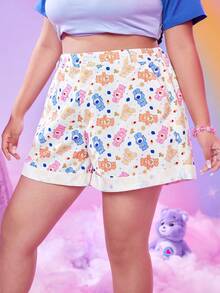 ROMWE X Care Bears Plus Heart & Cartoon Graphic Roll Up Hem Shorts
