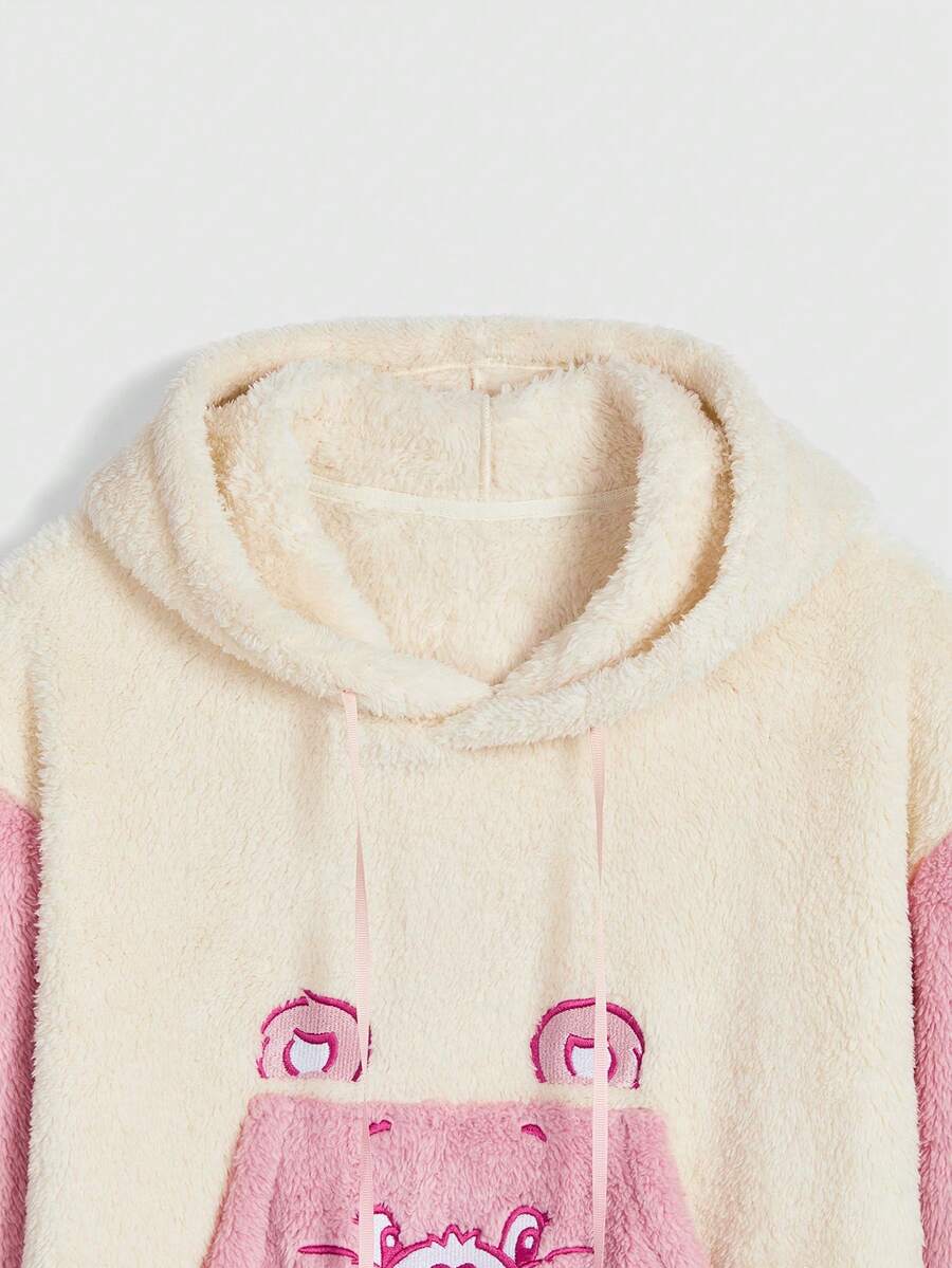ROMWE X Care Bears Women Casual Cute Embroidered Cartoon Bear Loose Kangaroo Pocket Drawstring Hoodie Teddy Sweatshirt, Autumn/Winter