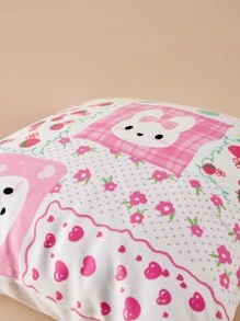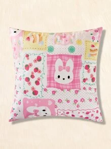 Kawaii 1pc Strawberry & Rabbit Print Cushion Cover Without Filler, Cartoon Fabric Animal Print Decorative Square Cushion Cover For Sofa, Bed