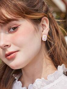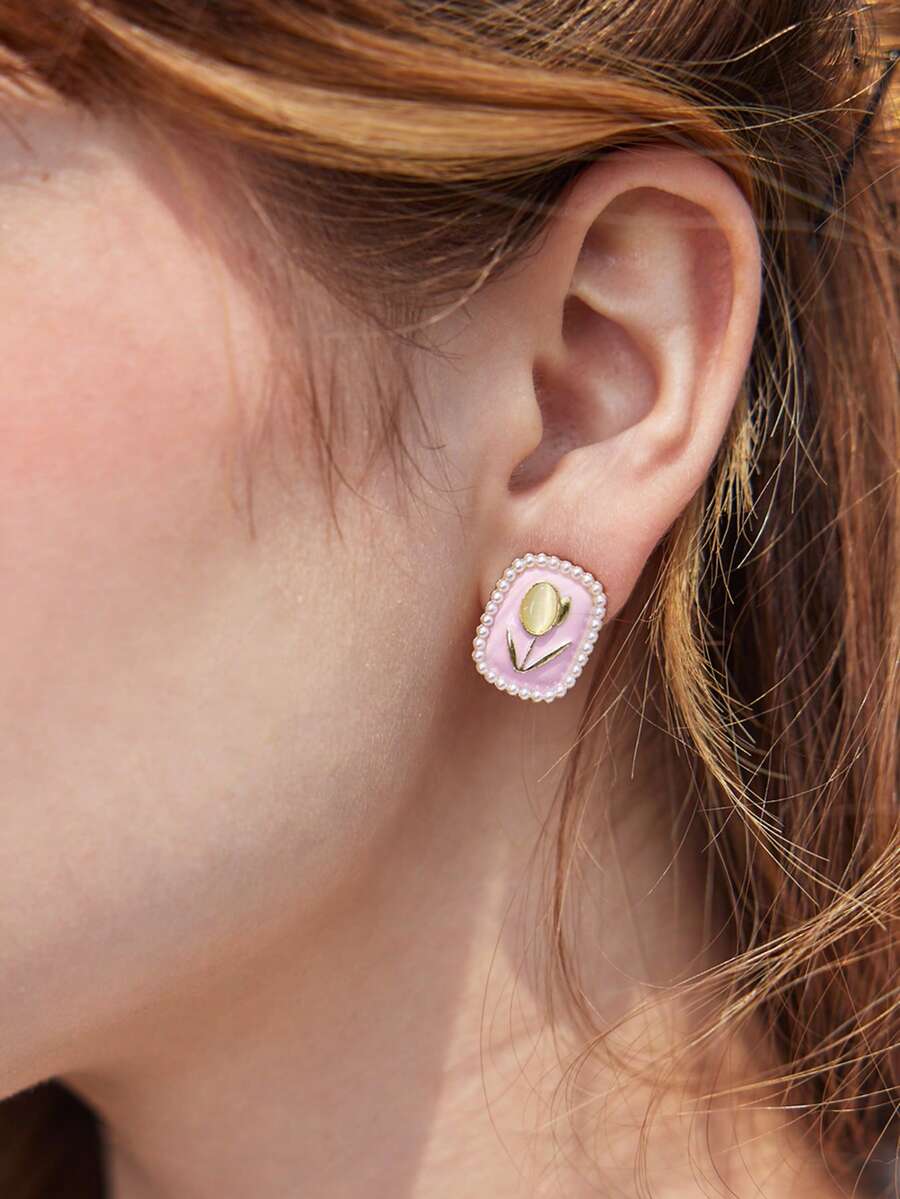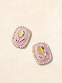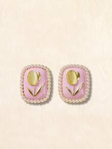 Kawaii Faux Pearl & Flower Decor Rectangle Stud Earrings