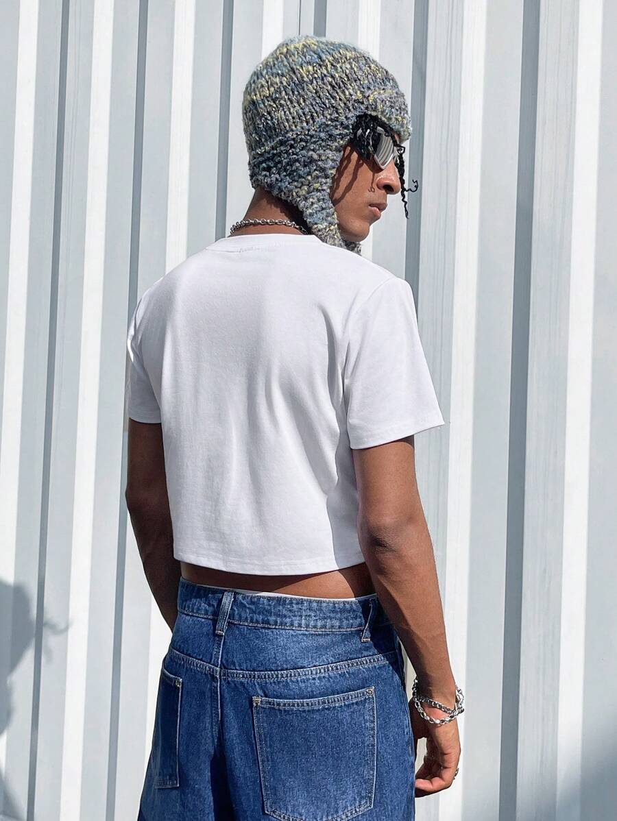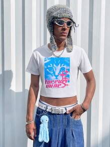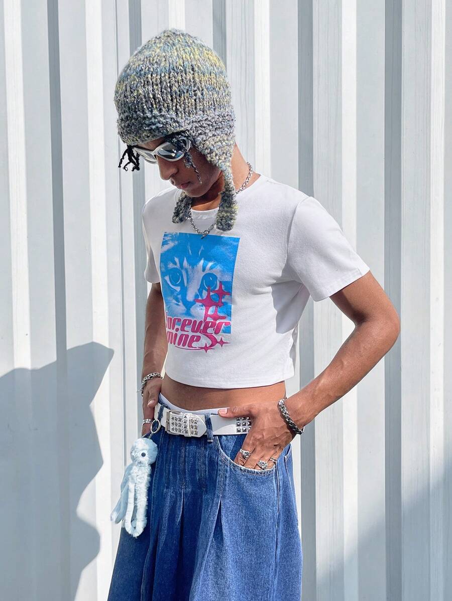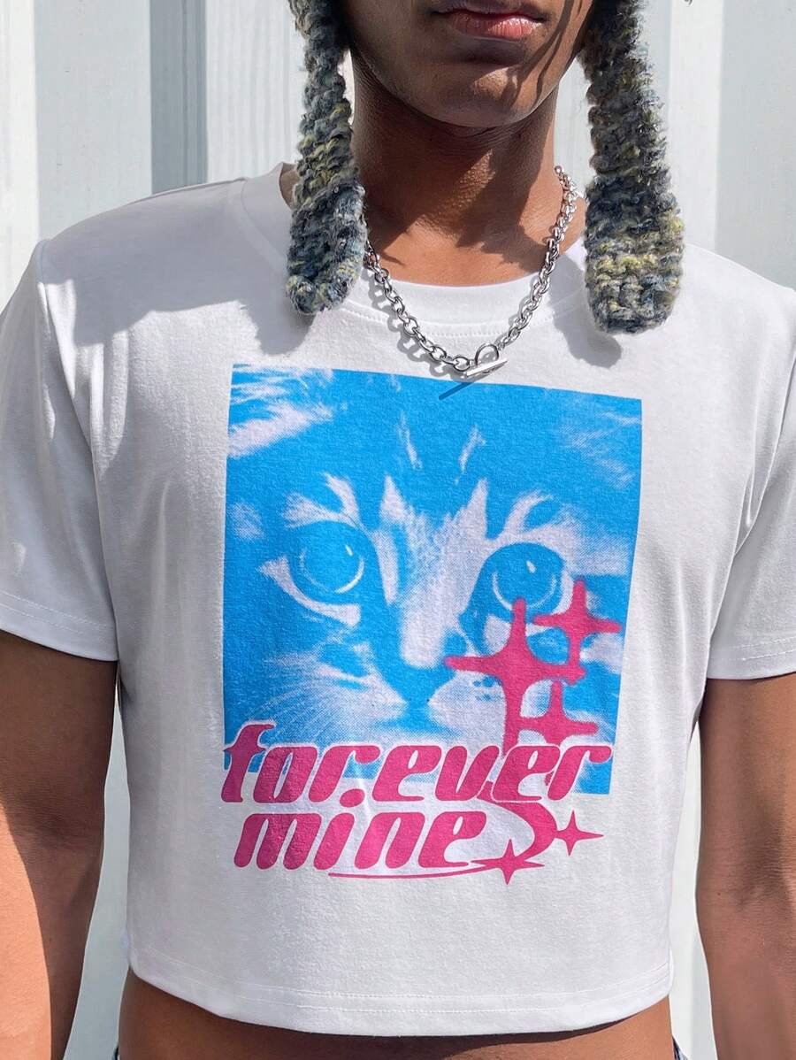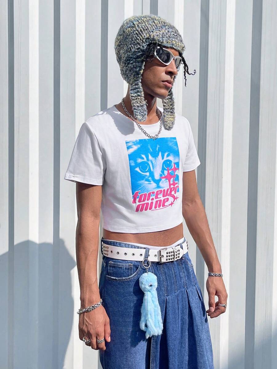 Rat Studio Men'S Cat & Letter Printed Crop Top T-Shirt