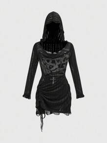 Grunge Punk Romantic Punk Letter Print Multi-Wear Loose Neck Long Sleeve Hooded Drawstring Hem Mini Dress Set For Women