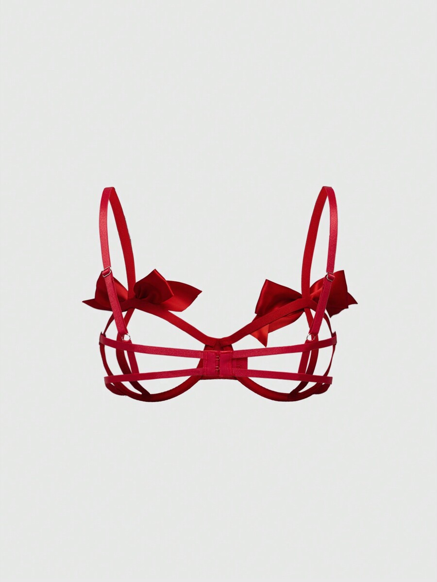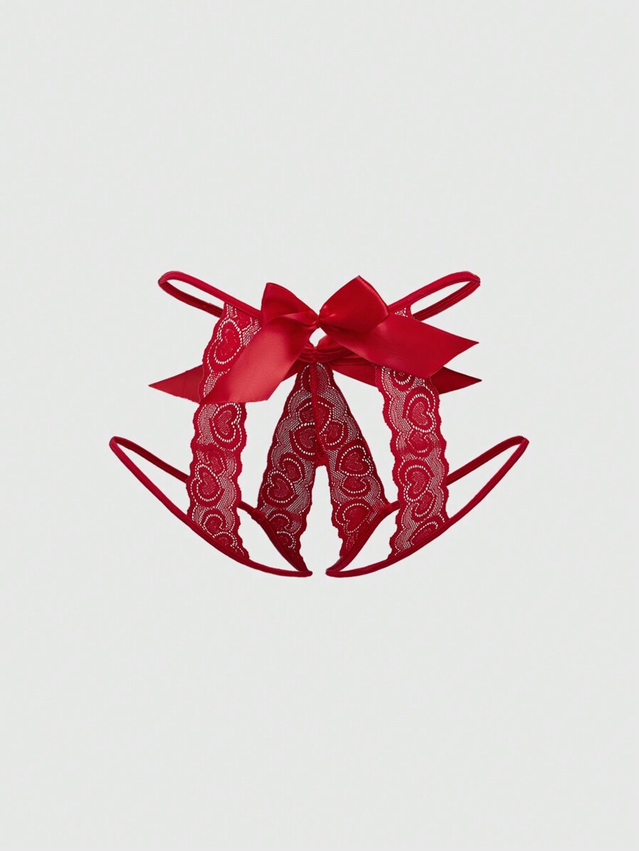Romantic Valentine's Day Bow Decor Bra And Panty Lingerie Set With Underwire, Lace Design