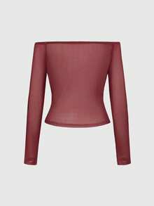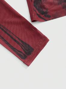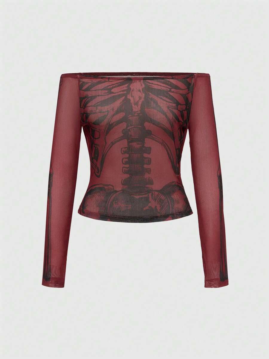 Grunge Punk Sexy Off-Shoulder Skeleton Print Sheer Mesh Top
