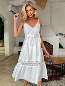 Simplee Guipure Lace Insert Belted Dress