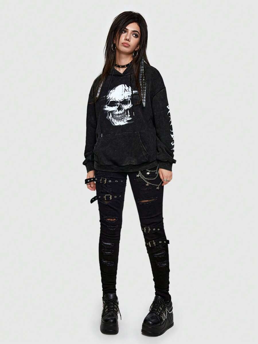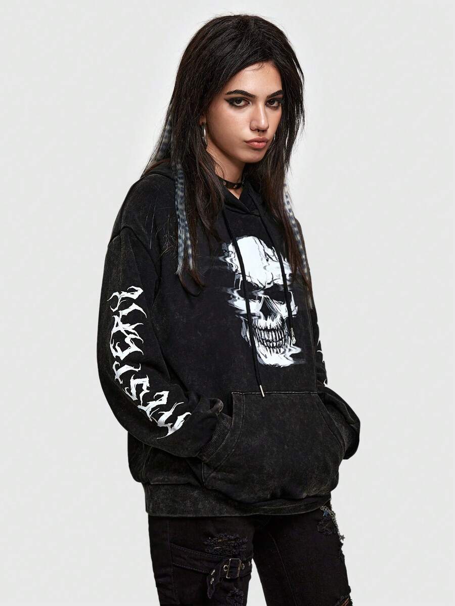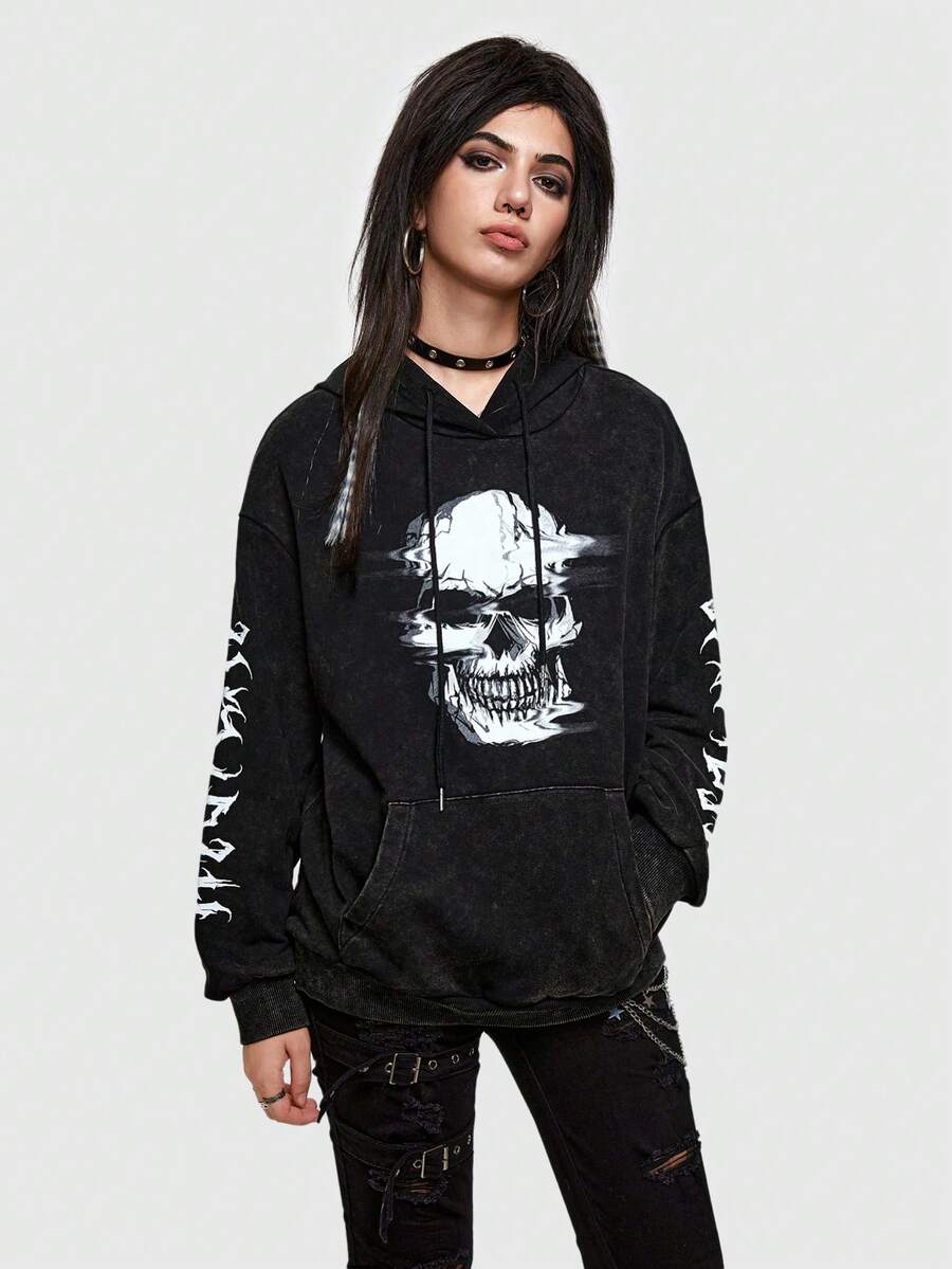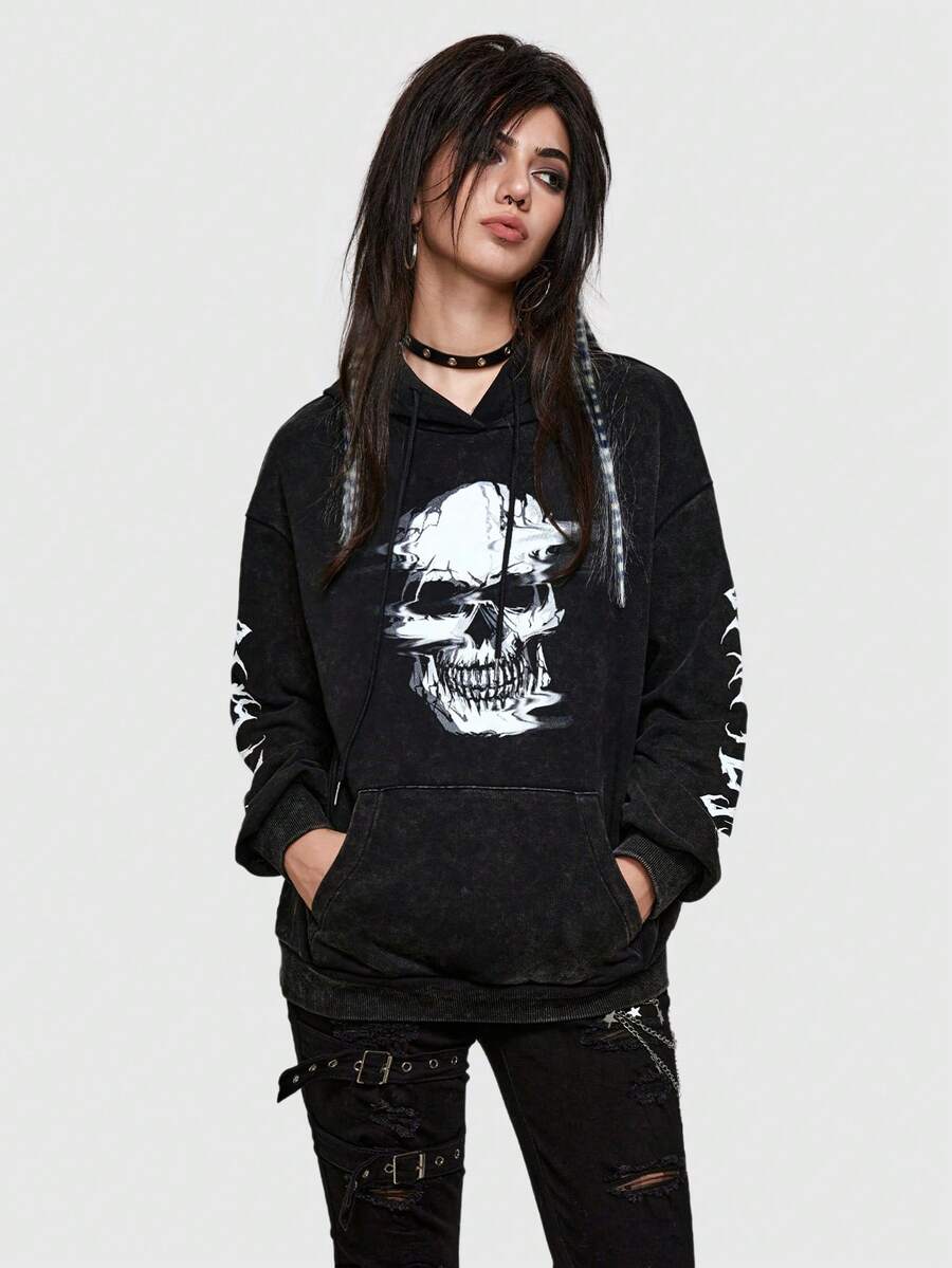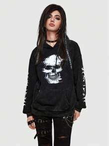 Grunge Punk Skull Print Drop Shoulder Hoodie