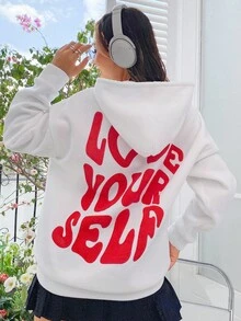 Slogan Graphic Drop Shoulder Drawstring Thermal Lined Hoodie LOVE YOURSELF Pullover Fall Outfit