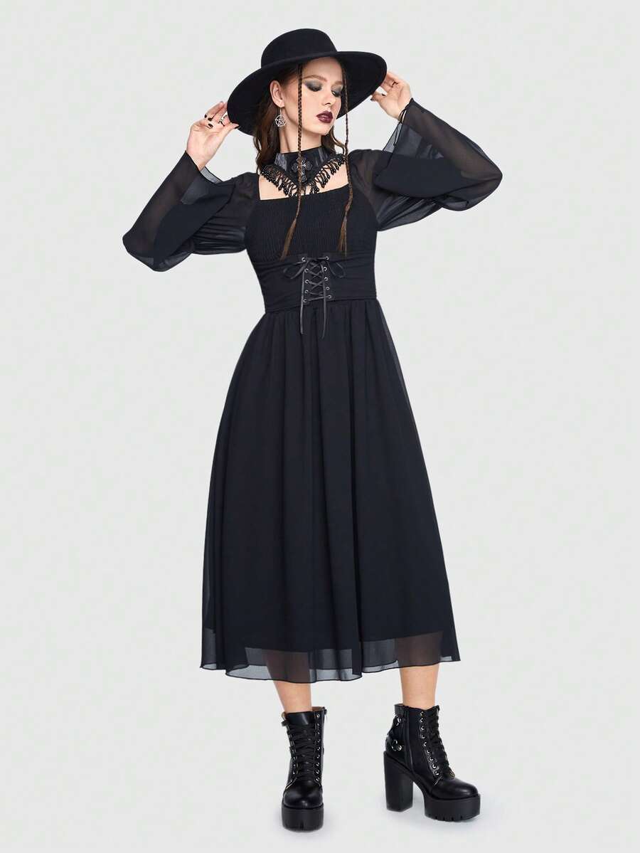 Goth Solid Contrast Mesh Shirred Dress Without Corset