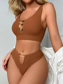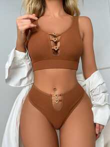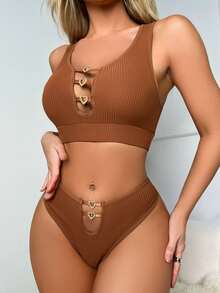 Solid Cut Out Rhinestone Decor Ribbed Lingerie Set