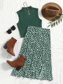 Solid Mock Neck Tank Top & Allover Print Skirt