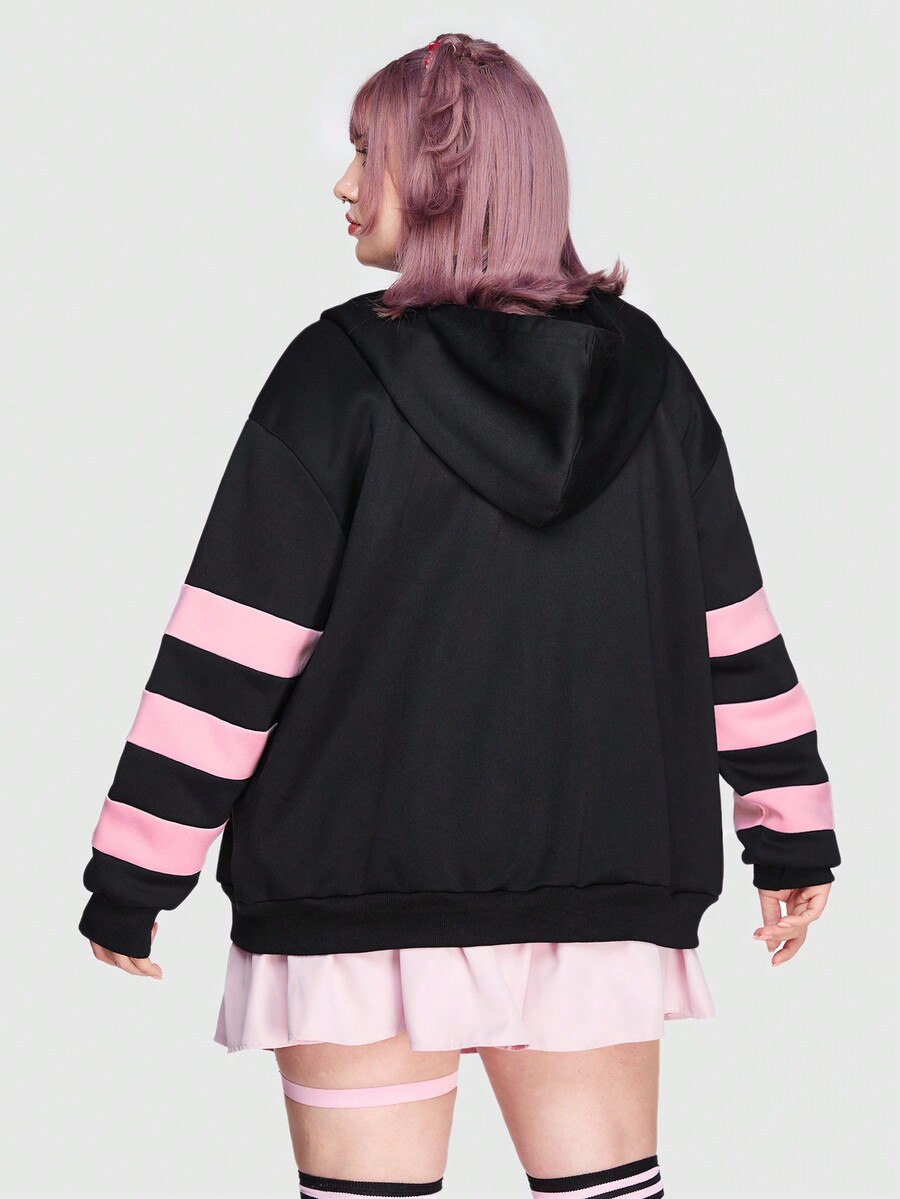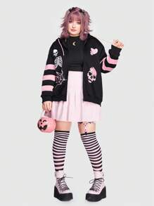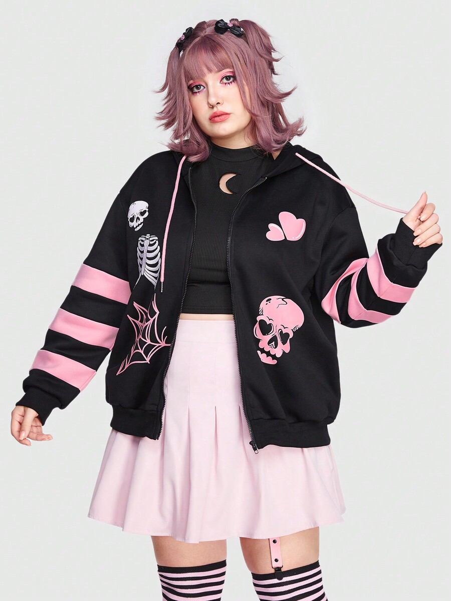 Sonchs Curiosities Plus Striped & Skull Print Drop Shoulder Zip Up Hoodie