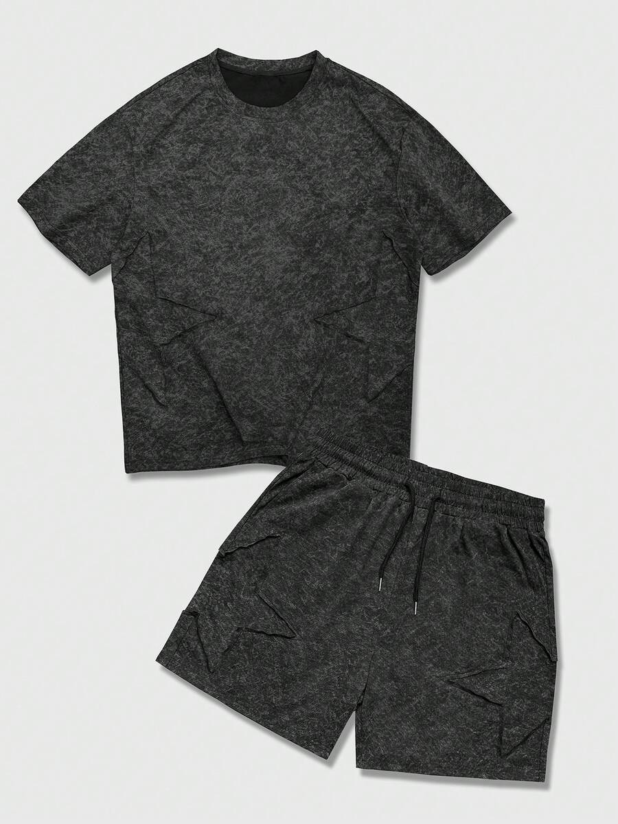 Essentials Spring/Summer Casual Graphic Men'S Casual Daily Commute Star Patch Washed Short Sleeve T-Shirt And Drawstring Waist Shorts Set, Summer