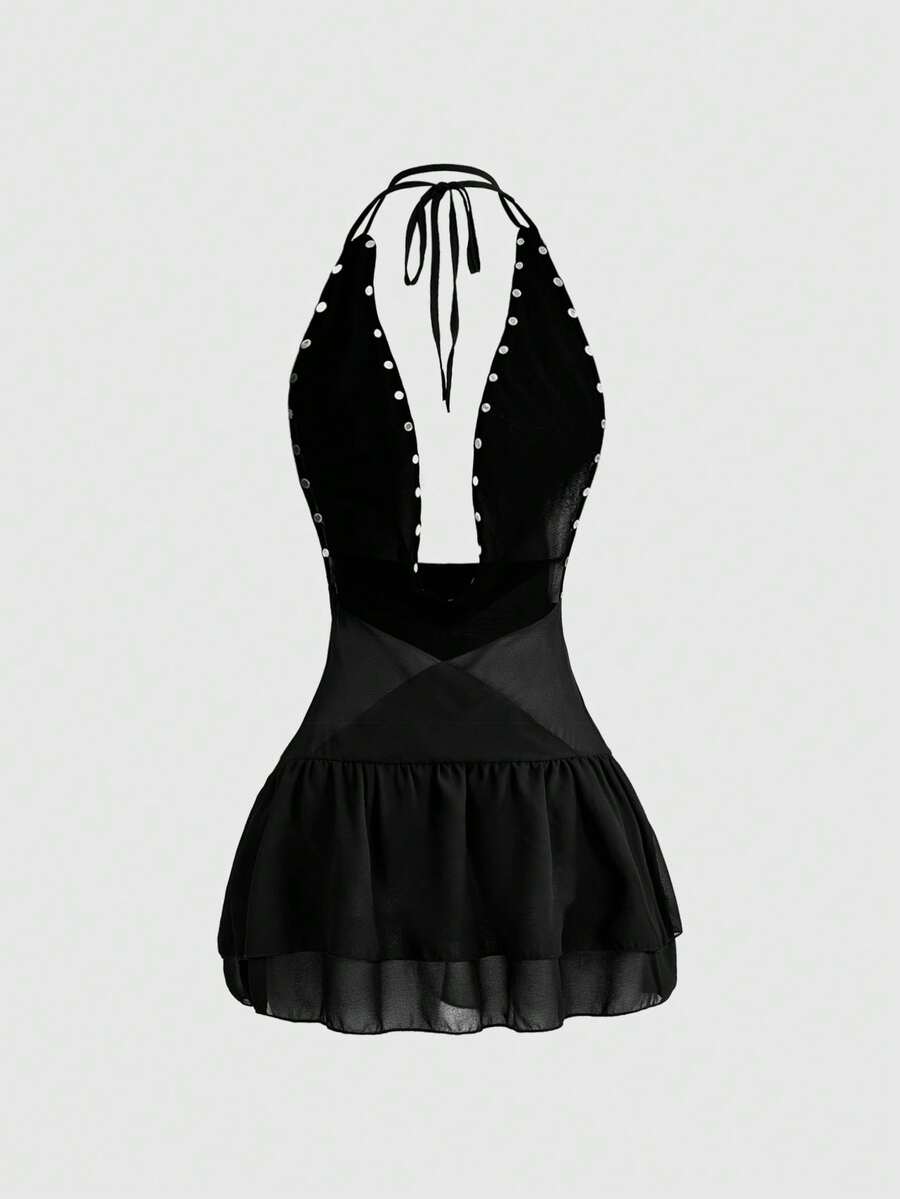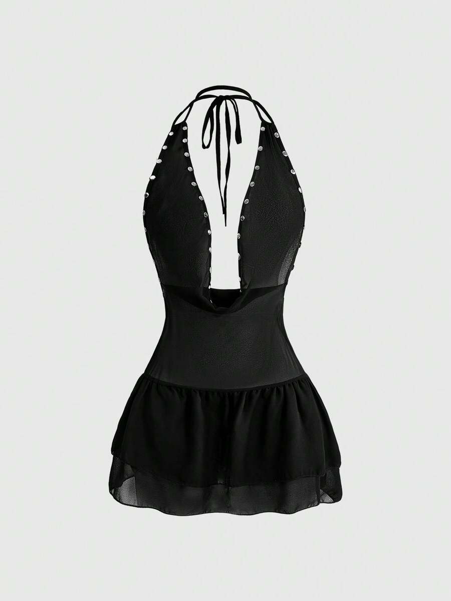 Grunge Punk Spring/Summer Party Vacation Sexy Deep Draped Neck Backless Spaghetti Strap Mini Dress With Vintage Loose Neckline, Backless Design