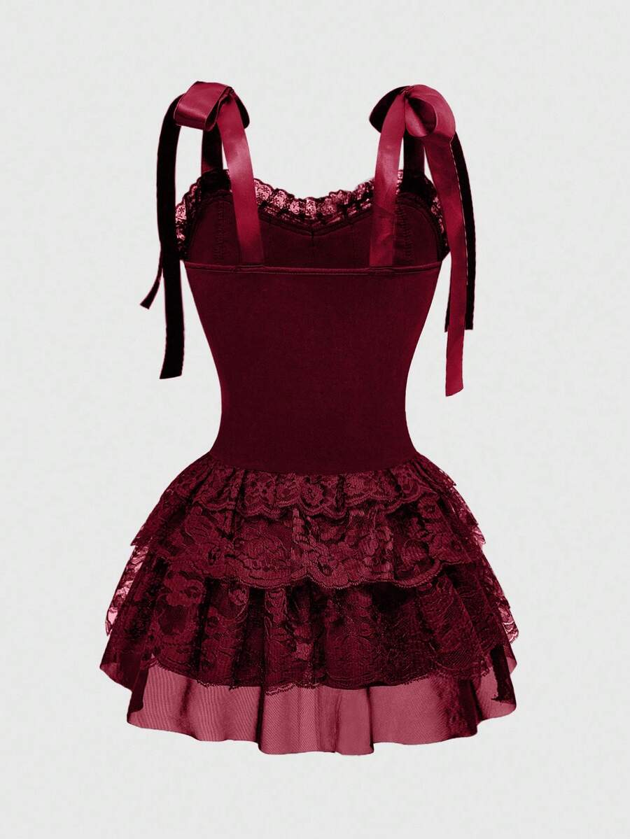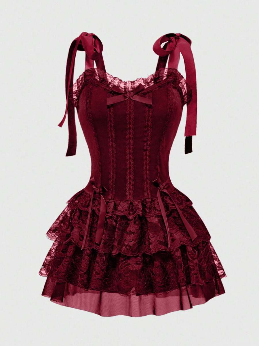 Spring/Summer Red Gothic Retro Palace Style Contrast Color Lace Trim Cross Pendant Women Velvet Halter Tie Strap Dress