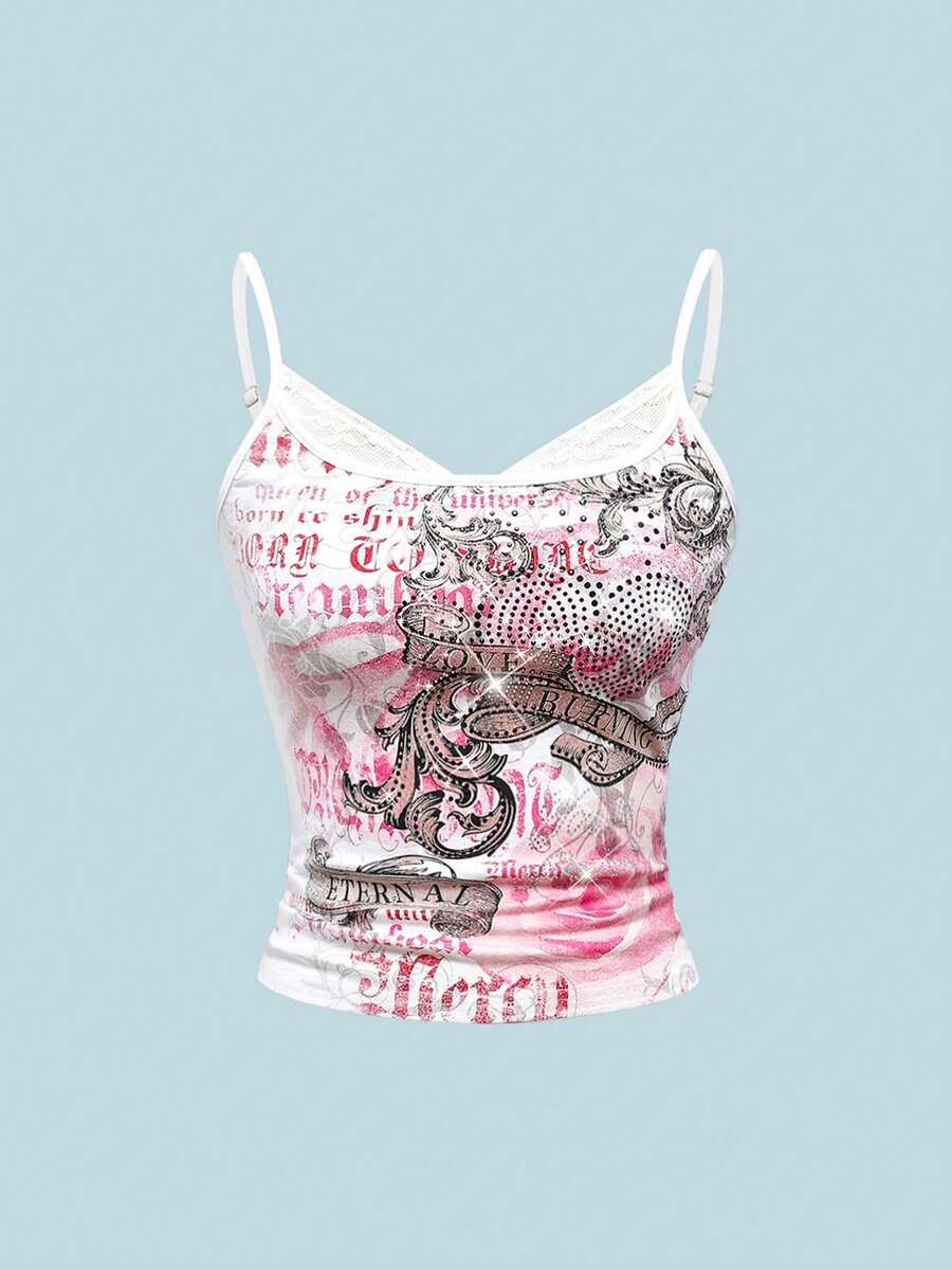 Grunge Punk Spring/Summer Valentine's Day Summer Concert Festival Y2K Chic Retro Romantic Rose Floral & Vine Heart Rhinestone Embellished Crop Top For Women