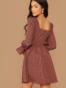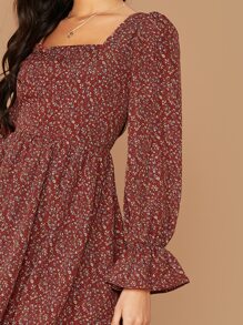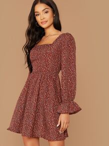 Square Neck Flounce Sleeve Ditsy Floral Dress